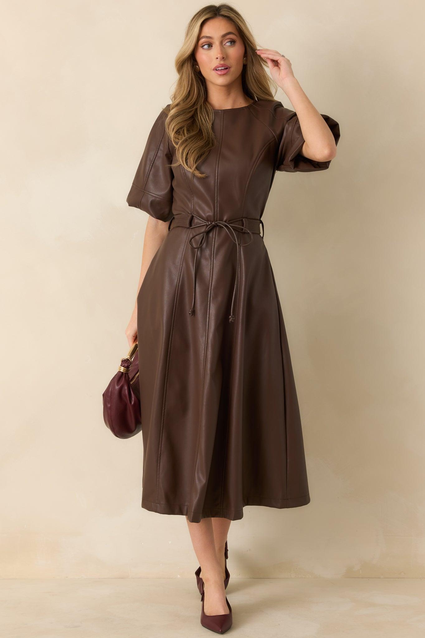 You’re officially the one to watch in the Something to Behold Brown Faux Leather Short Sleeve Belted Midi Dress. Luxe faux leather, a flawless fit, and a subtle waist-cinching tie come together in a look that feels powerful without trying too hard. It’s the kind of dress that turns a simple outing into a style moment. This brown faux leather midi dress features a soft sheen finish, clean vertical seaming for a flattering drape, short raglan sleeves, a crew neckline, and an adjustable waist tie for customizable shape. The A-line skirt offers comfortable movement. Finished with a concealed back zipper closure and full lining. 50% Polyester & 50% Polyurethane Lining: 97% Polyester & 3% Spandex Hand Wash Cold, Dry Clean Only Manufactured in China Designed in The USA Model is 5'8" and Wearing a Size Small, Clipped, Model is a True X-Small.