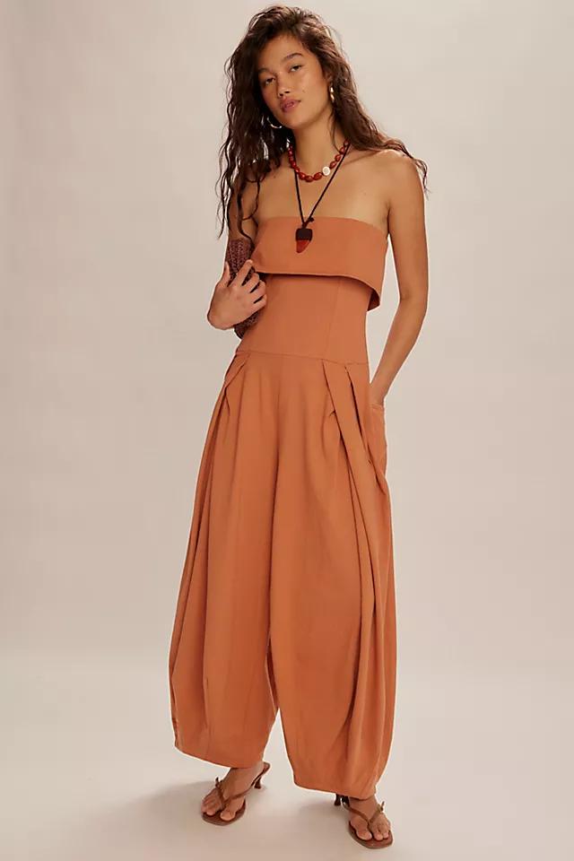 **Features:** Foldover detail at the bust, back button detailing, pleating at the pants, pull-on design