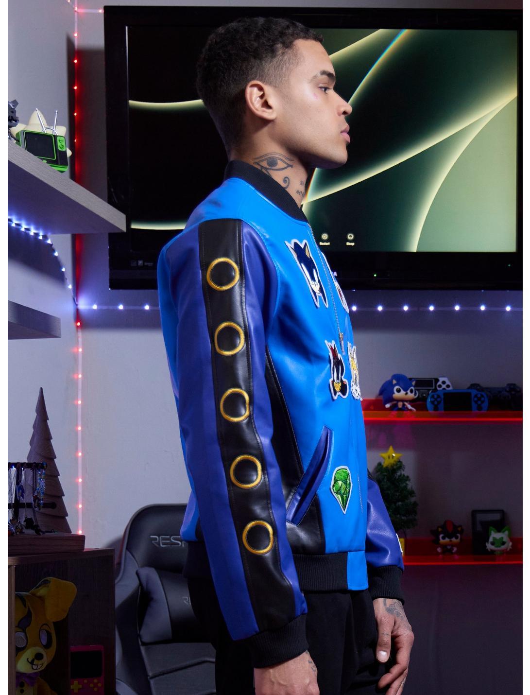 Rev up your style in this Sonic the Hedgehog varsity jacket! It has blue and black color-blocking with patches of Sonic and his friends on the chest, plus more patches on the sleeves and pockets. Don't forget to collect the gold rings that are embroidered down one sleeve!Shell: 100% polyesterContrast: 95% cotton; 5% spandexLining: 97% cotton; 3% spandexWash cold; dry lowImportedListed in men's/unisex sizesModel wears size Medium