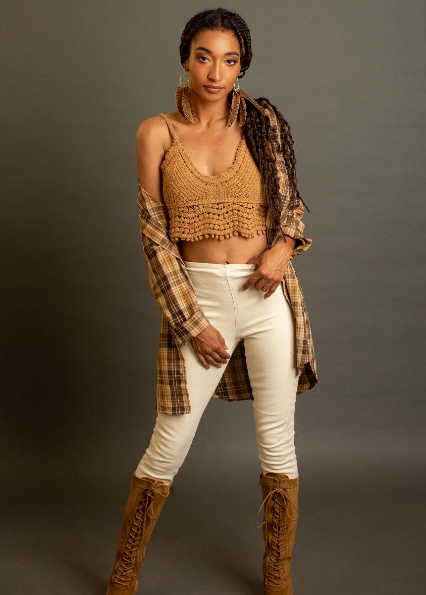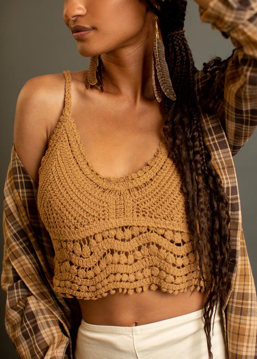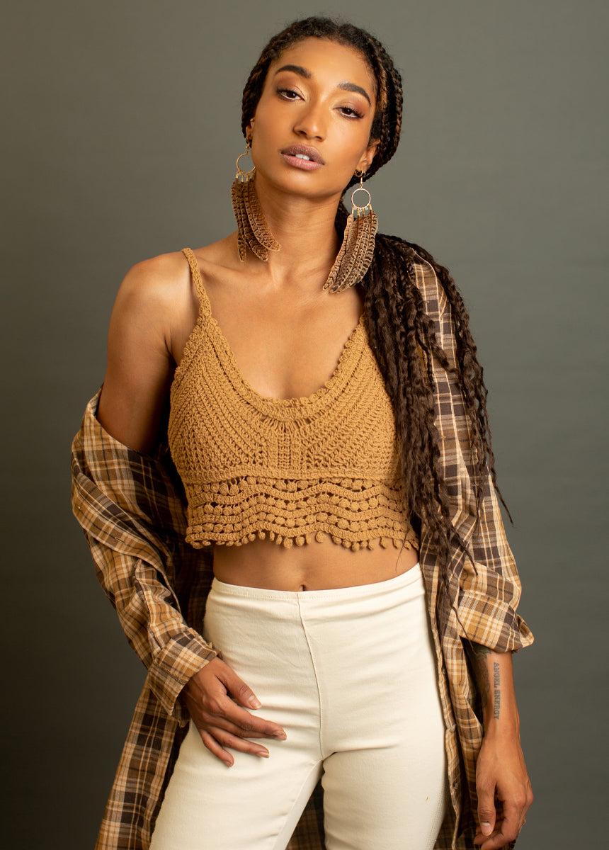 Get your boho vibes on point with our Sonnet Crochet Top in Tarnished Gold! This cropped top features intricate crochet detailing, perfect for adding a touch of whimsy to any outfit. Embrace your inner free spirit and stand out from the crowd with this uniquely stylish top. Cropped V-Neck 95% Cotton, 5% Polyester Hand wash only, line dry Model is 5'8" wearing a size S