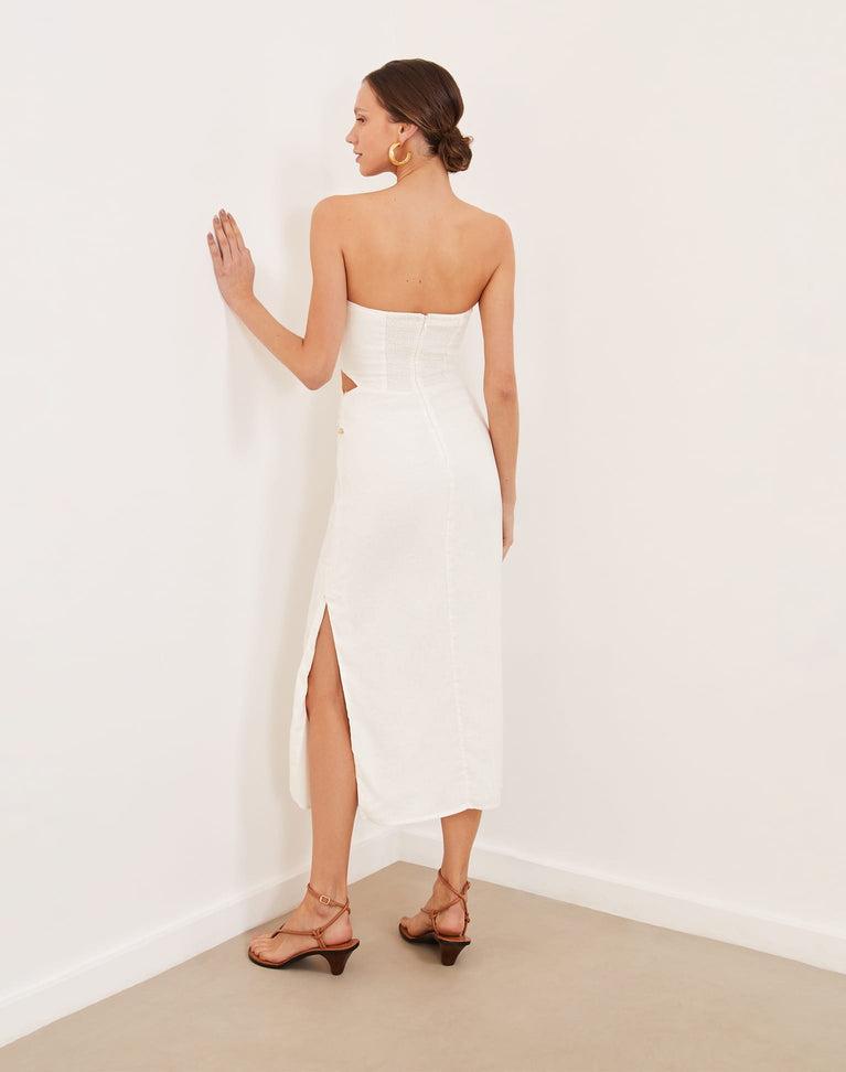Midi dress featuring a structured bust, a waist cutout, and a gently flared skirt. The side slit is adorned with a metal pin detail, complementing the neckline. It comes complete with lining, zipper, and elastic. Versatile dress can be worn during the day with sandals or add heels and accessories for a night out. Features: Front slit Back zipper closure Smocked elastic back Fully lined Strapless Style# 277-816-003