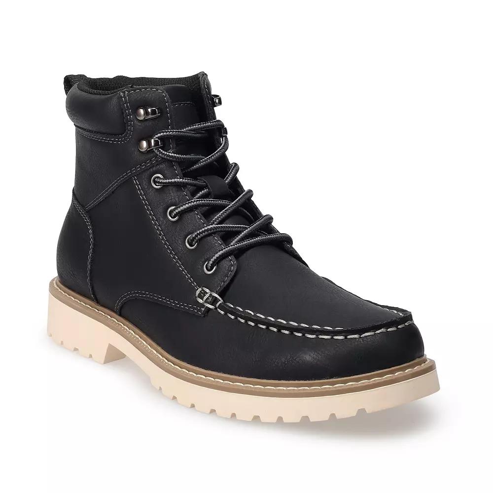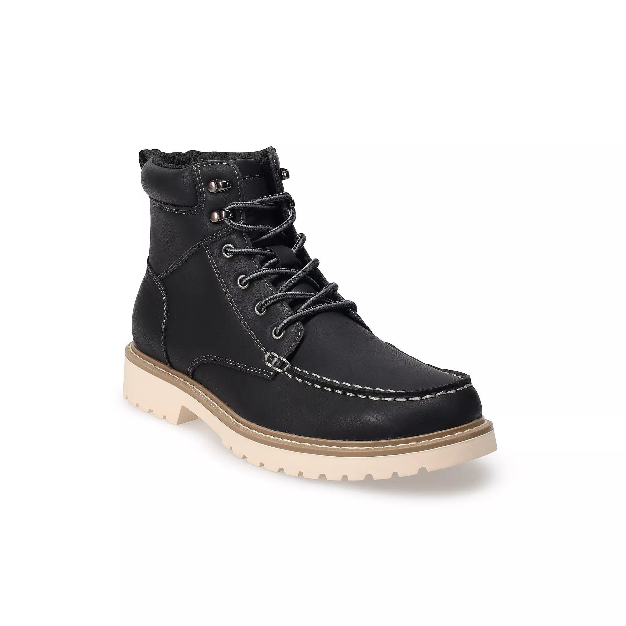 Take on the trails in comfort and confidence with these Sonoma Goods For Life Harlann Mens Moc Toe Lug Sole Hiker Boots. Click this FOOTWEAR GUIDE to find the perfect fit and more! Take on the trails in comfort and confidence with these Sonoma Goods For Life Harlann Mens Moc Toe Lug Sole Hiker Boots. Click this FOOTWEAR GUIDE to find the perfect fit and more! FEATURES Ortholite comfort foot bed provides comfort and arch support Cushioned collar and tongue for maximum comfortDETAILS Synthetic upper Textile lining EVA midsole TPR outsole Moc toe Lace-up closure Foam footbed Lug outsole Heel height: 1 in. Platform height: 0.5 in. Boot shaft: 5 in. Boot shaft circumference: 13 in. Spot clean Imported Size: 12. Color: Black. Gender: male. Age Group: adult.