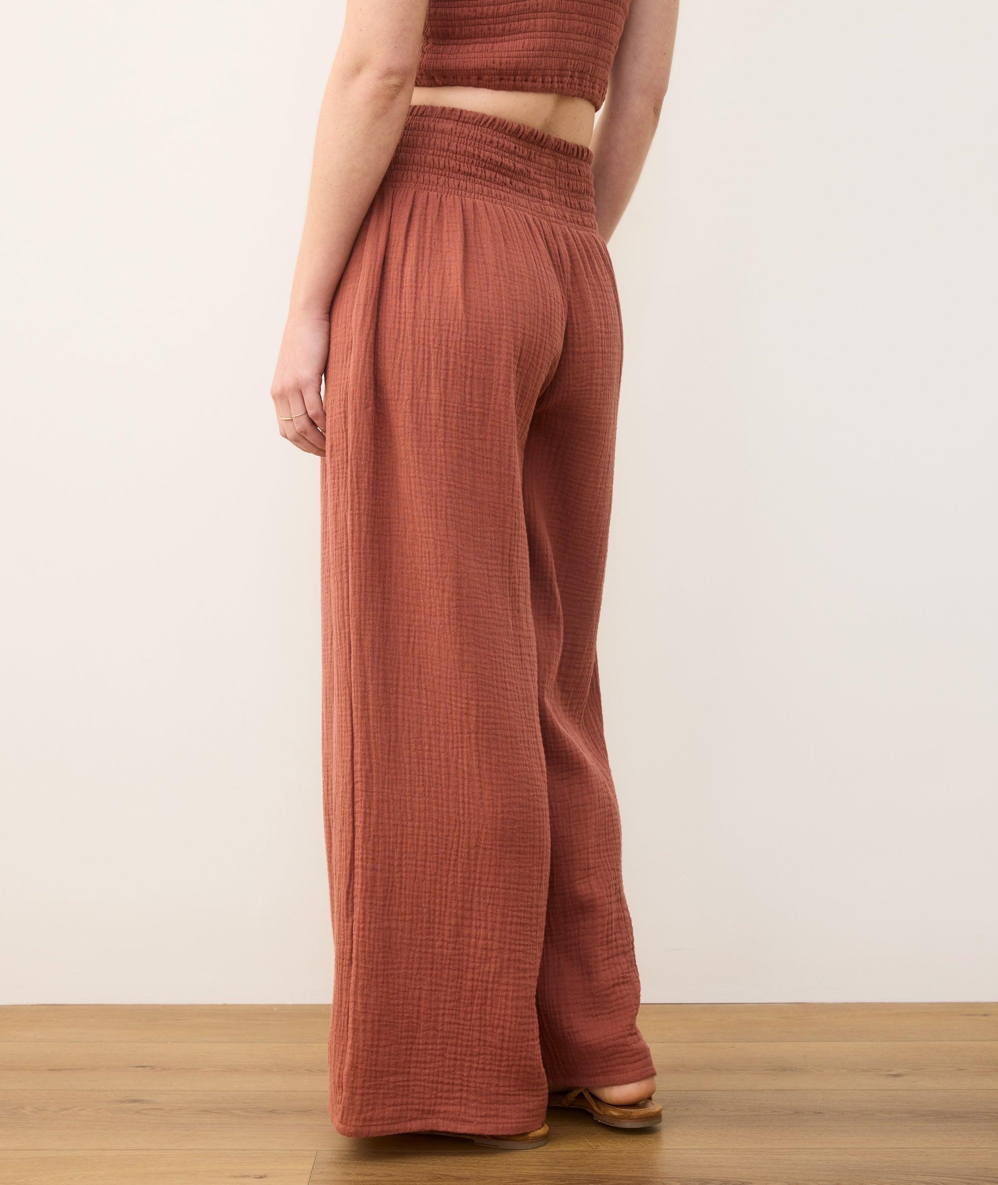 Here it is, folks. We've perfected the summertime beach pants. These pants feature our perfectly textured Double Cloth, so they're light and packable. Plus, they've got a high-rise, smocked waistband, full-length, wide leg, and work perfect with any ML tops.