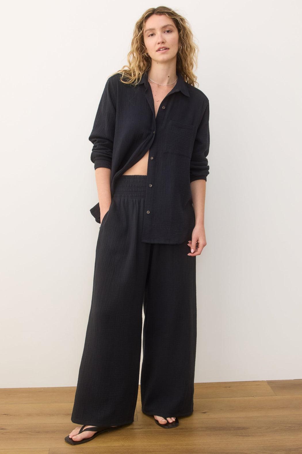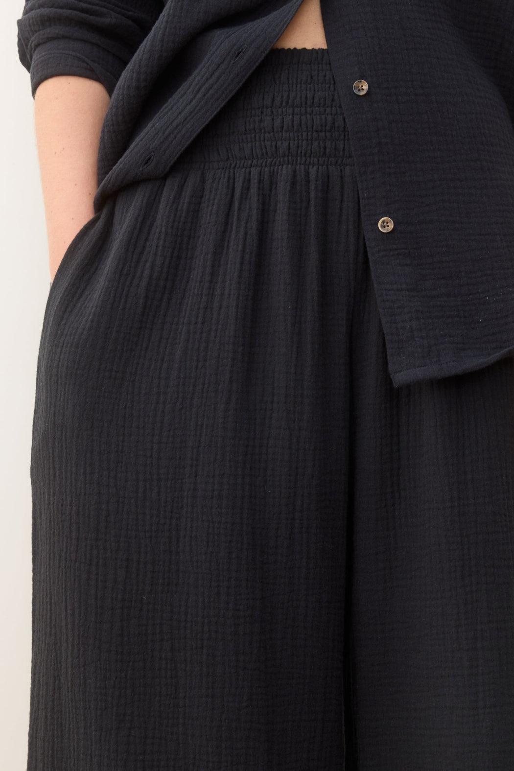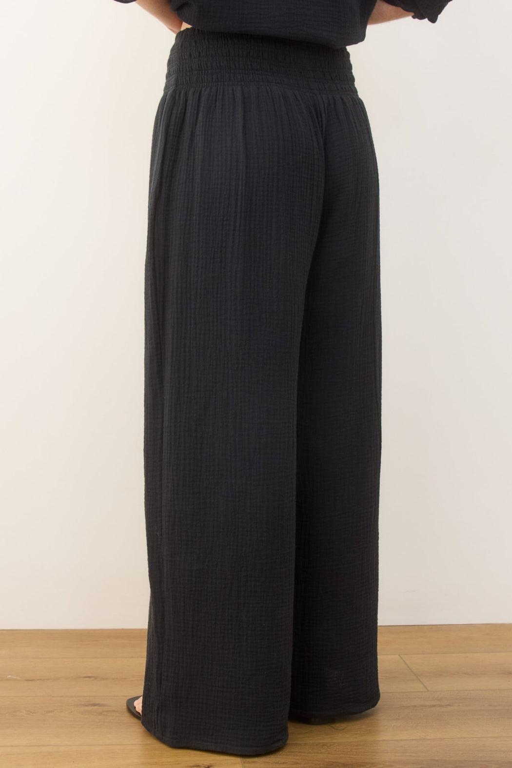 Here it is, folks. We've perfected the summertime beach pants. These pants feature our perfectly textured Double Cloth, so they're light and packable. Plus, they've got a high-rise, smocked waistband, full-length, wide leg, and work perfect with any ML tops.