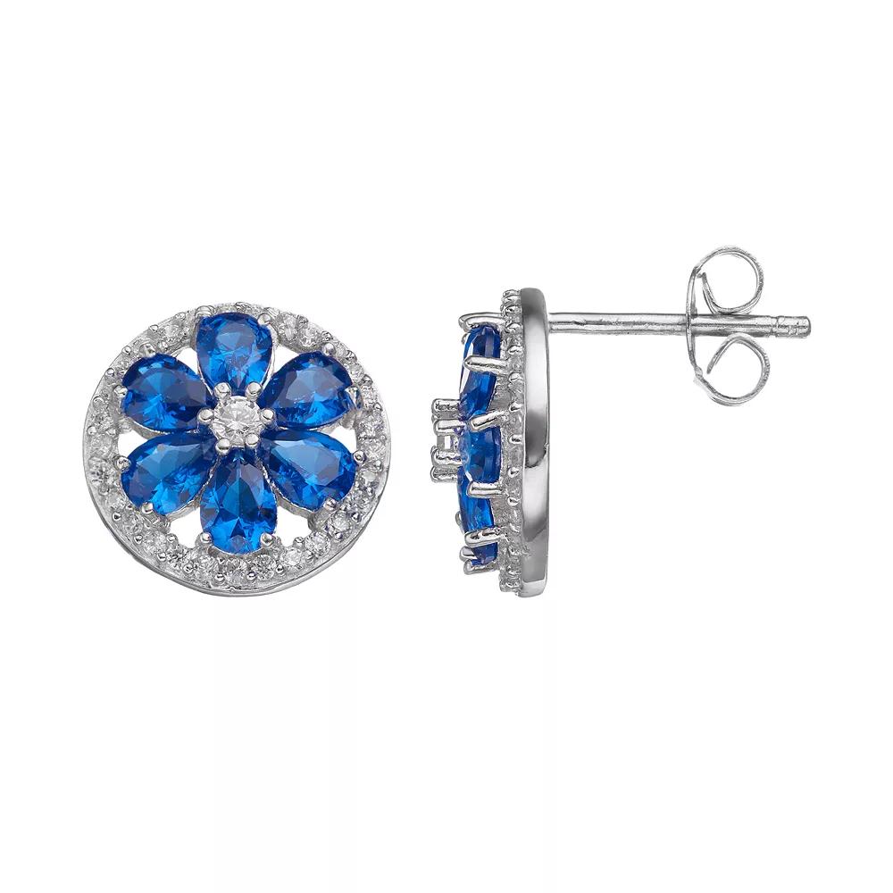 Featuring lab-created blue spinel gemstones and cubic zirconia accents, these flower stud earrings offer feminine charm. Comes in a gift box. EARRING DETAILS Length: .47 in. Backings: post Metal: rhodium-plated sterling silver STONE DETAILS Stone type: lab-created blue spinel Total weight: 3 ct. Shape: pear Setting: prong CUBIC ZIRCONIA DETAILS Total weight: 5/8 ct. Shape: round Setting: prong Size: One Size. Gender: female. Age Group: adult.