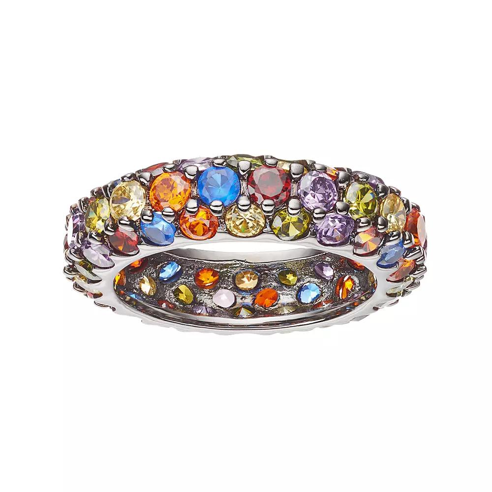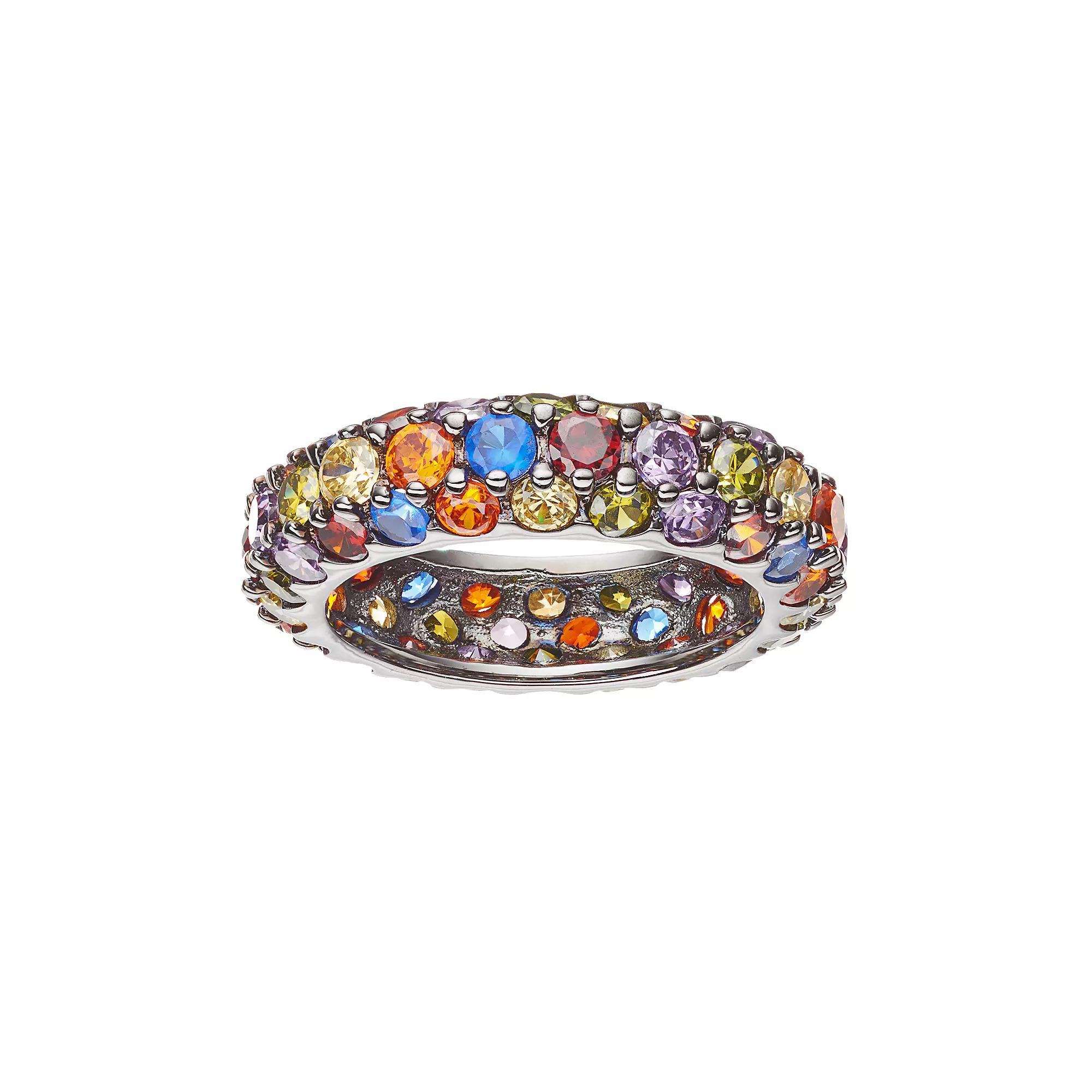 Adorned with an array of colorful cubic zirconia and lab-created blue spinel stones, this Sophie Miller ring offers a gorgeous glow. Comes in a gift box. RING DETAILS Width: 6 mm Metal: black rhodium-plated sterling silver STONE DETAILS Stone type: lab-created blue spinel Total weight: 3/4 ct. Shape: round Setting: prong CUBIC ZIRCONIA DETAILS Total weight: 5 1/5 ct. Shape: round Color: orange, yellow, green, purple, red Setting: prong Color: Multicolor. Gender: female. Age Group: adult.