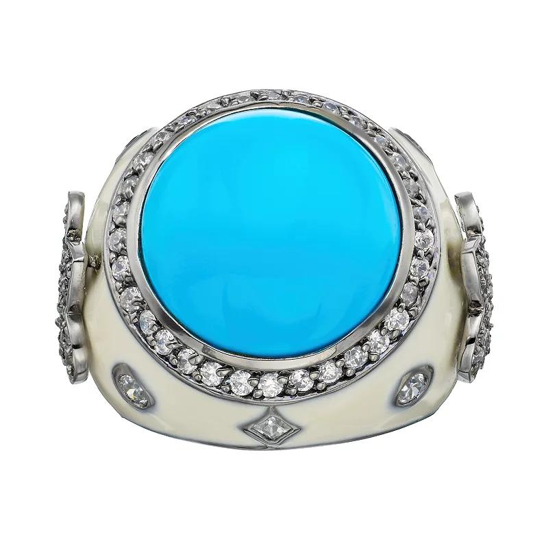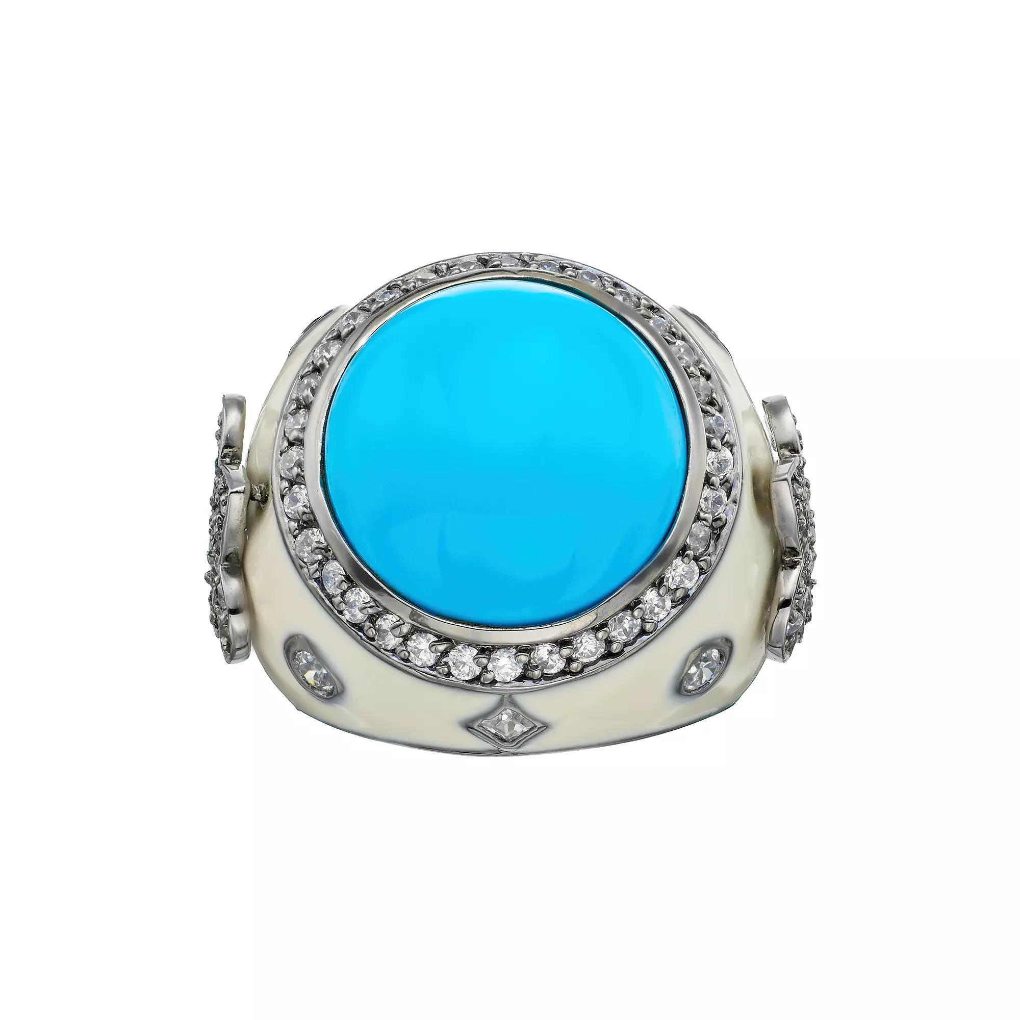 A simulated turquoise cabochon and black rhodium-plated sterling silver construction make this Sophie Miller ring a stand-out choice. Cubic zirconia stones accenting the band and Fleur de Lis designs give it eye-catching style. Comes in a gift box.RING DETAILS Width: 1 in. Metal: black rhodium-plated sterling silver STONE DETAILS Stone type: simulated turquoise Shape: cabochon Setting: tension CUBIC ZIRCONIA DETAILS Shape: round, princess Setting: prong, bezel Size: 8. Color: Blue. Gender: female. Age Group: adult.