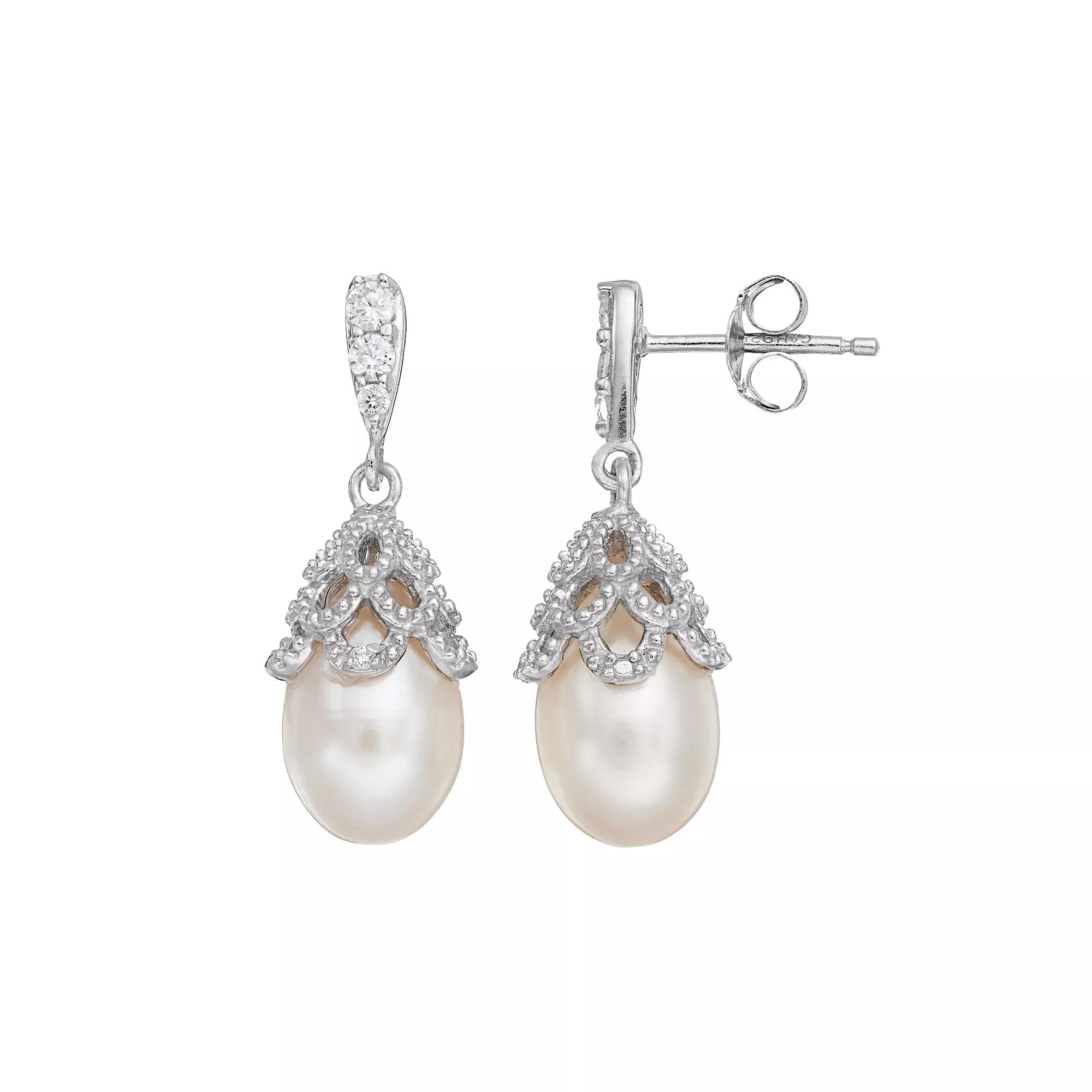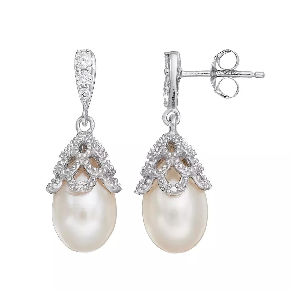 Dyed freshwater cultured pearls serve as the focal point on these sterling silver drop earrings, while cubic zirconia stones add a touch of sparkle.EARRING DETAILS Length: .87 in. Backings: post Metal: sterling silver Plating: rhodium Packaging: boxed CULTURED PEARL DETAILS Type: freshwater Shape: drop Size: 8 mm Color: dyed cream CUBIC ZIRCONIA DETAILS Total weight: 1/3 ct. Shape: round Setting: prong Gemstones may have been treated to enhance their appearance. Special care may be required. Please visit our Gemstone Treatment & Special Care Guide for more information. Size: One Size. Color: White. Gender: female. Age Group: adult. Material: Sterling Silver Rhodium.