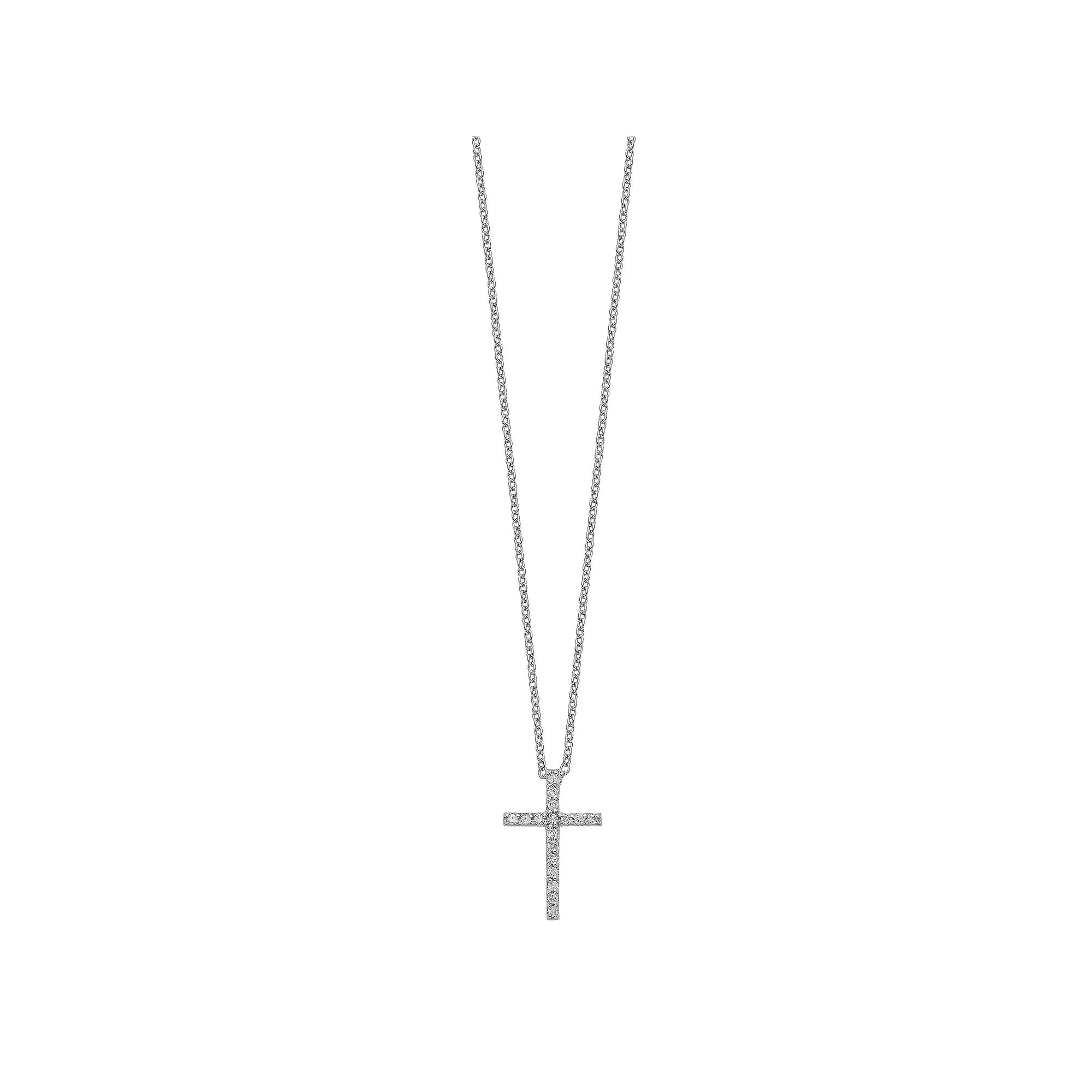 This Womens sterling silver & CZ cross necklace makes a great gift! This rhodium plated pendant is designed with white CZ stones. The necklace has a lobster claw closure. Size: 18 inches.