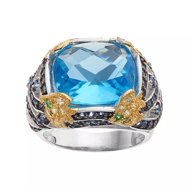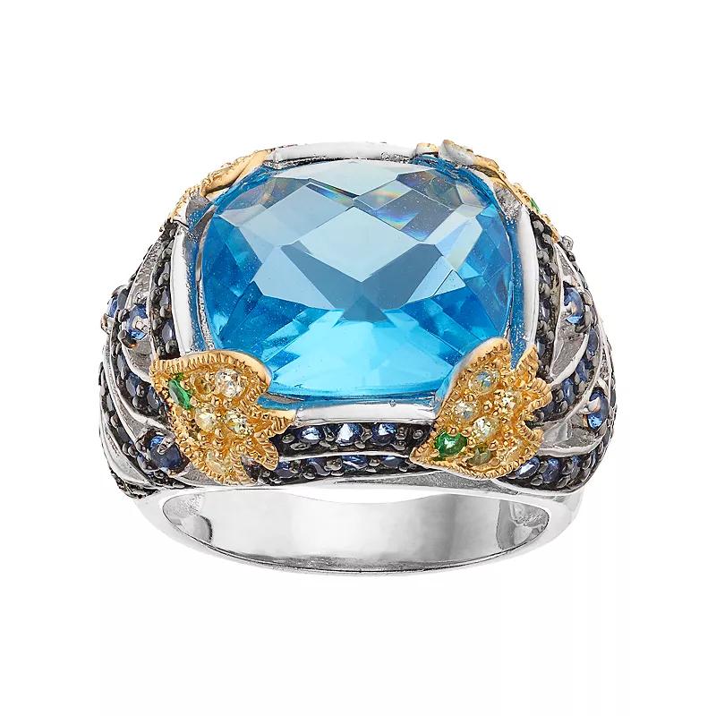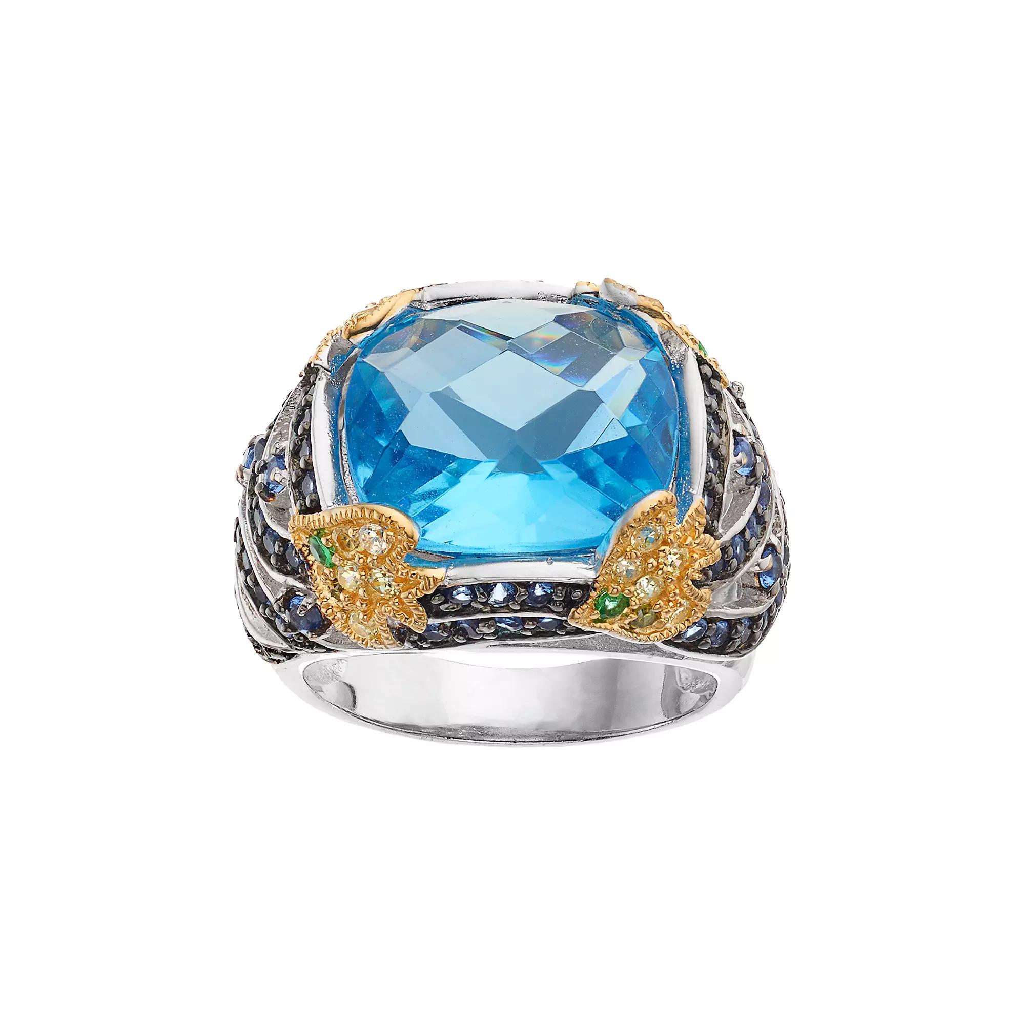 Decorated with a simulated aquamarine center stone and colorful simulated gemstone accents, this two-tone sterling silver cocktail ring offers a uniquely beautiful look.RING DETAILS Width: .51 in. Metal: sterling silver Plating: 14k gold, black & white rhodium Packaging: boxed STONE DETAILS Stone type: simulated aquamarine, simulated emerald, simulated sapphire Total weight: 9 3/8 ct. Center stone weight: 7 3/4 ct. Center stone size: 14 mm x 12 mm Shape: cushion cut, round Setting: prong CUBIC ZIRCONIA DETAILS Total weight: 5/8 ct. Shape: round Color: yellow Setting: prong Gemstones may have been treated to enhance their appearance. Special care may be required. Please visit our Gemstone Treatment & Special Care Guide for more information. Size: 6. Color: Blue. Gender: female. Age Group: adult. Material: Rhodium|Gold Over Sterling.