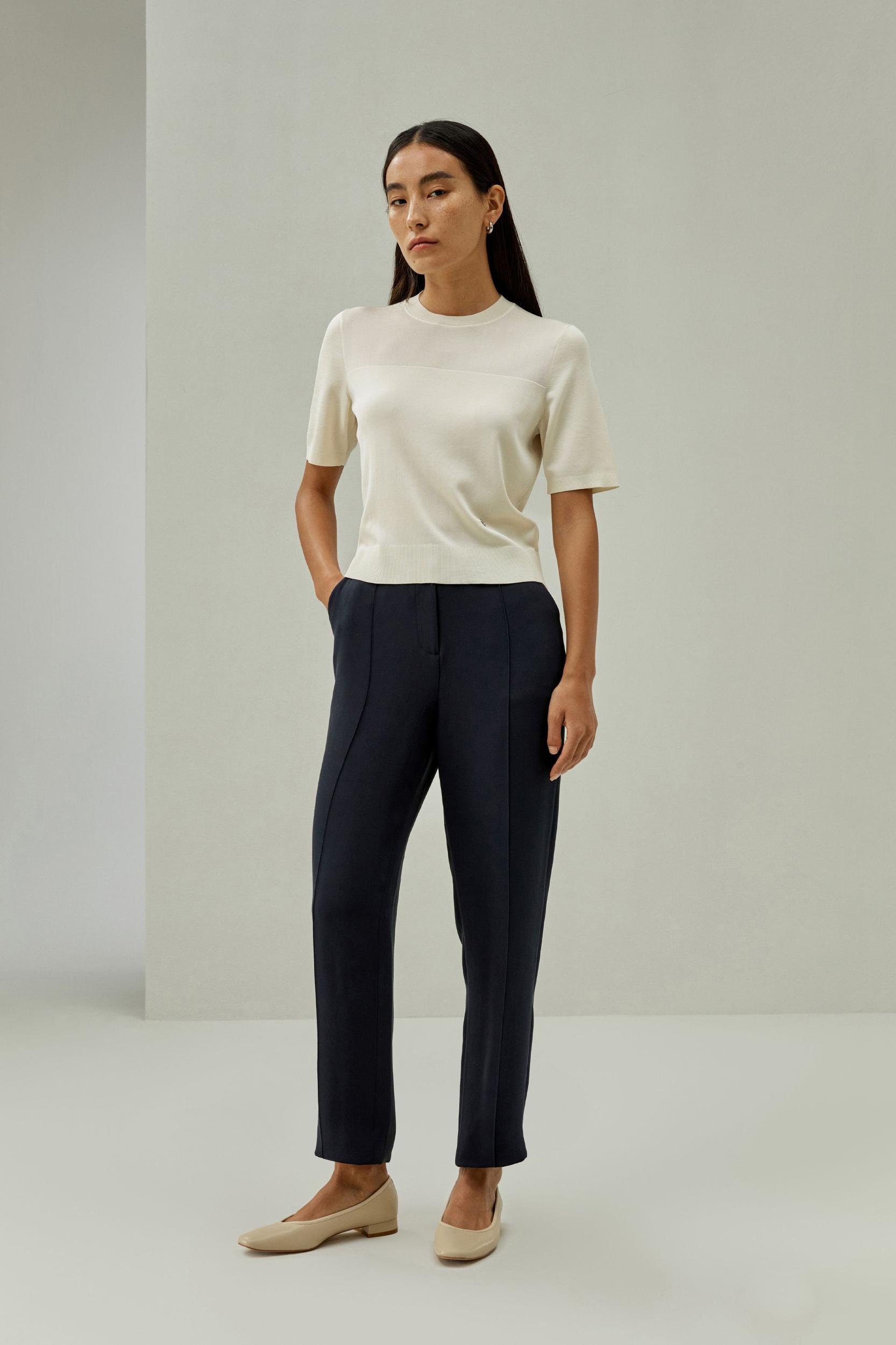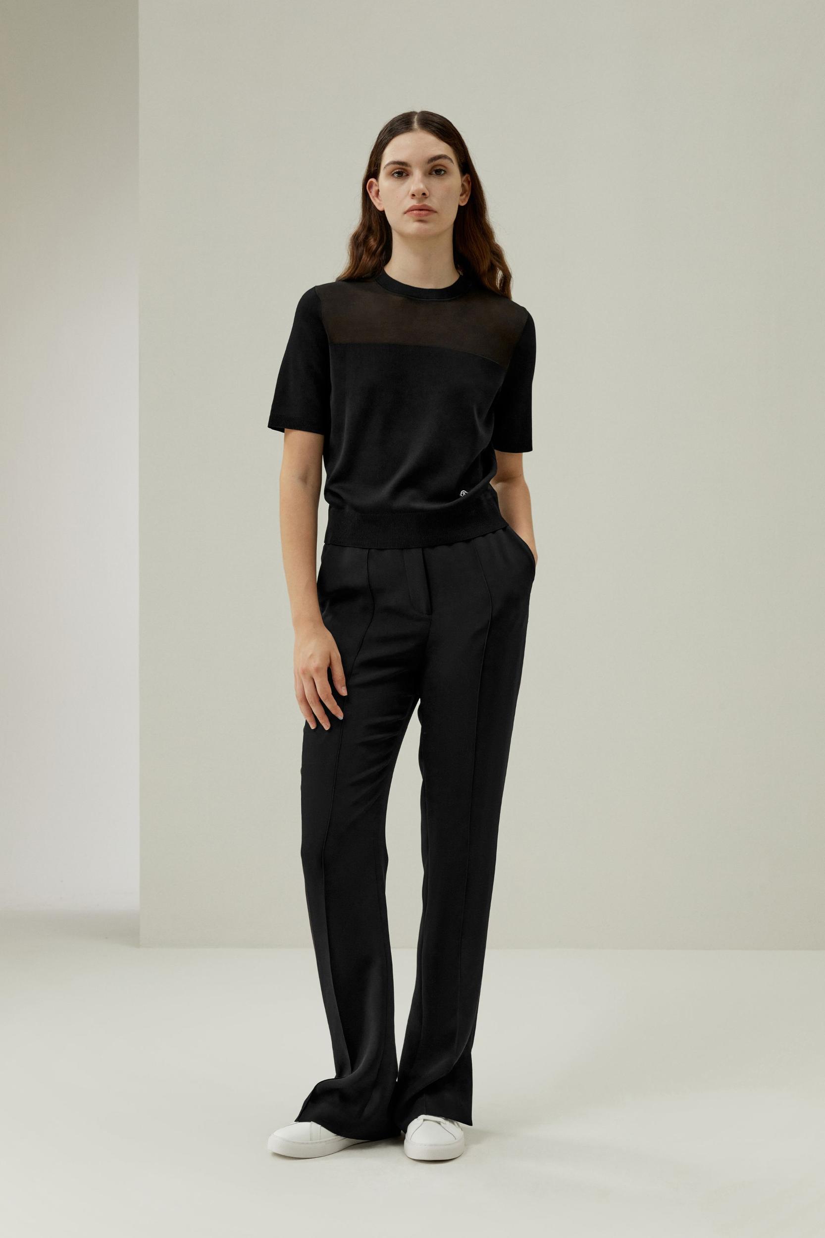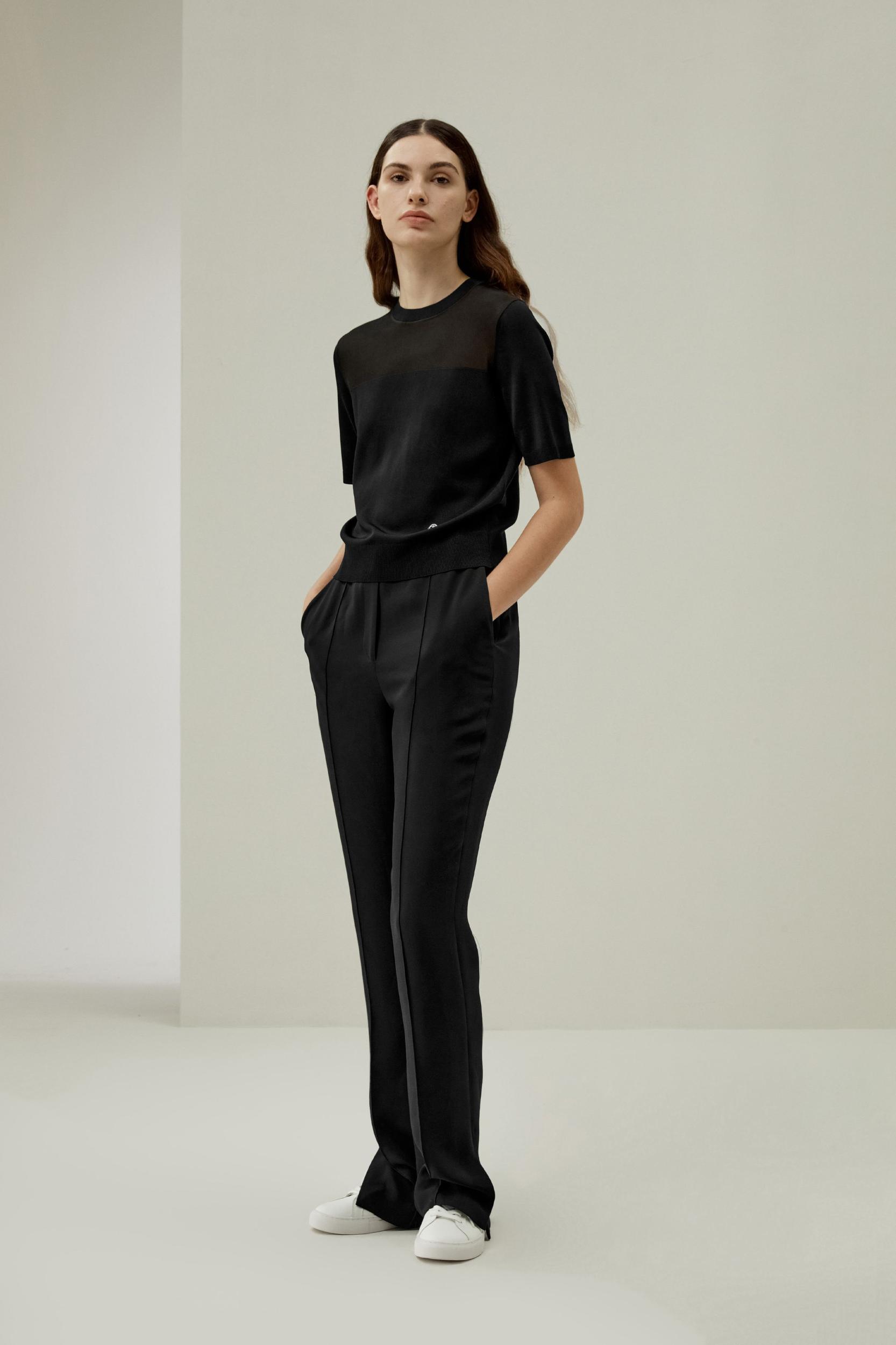 Elevate your everyday style with this sophisticated dual-knit silk t-shirt, featuring a waist-cinching design and breathable top section for a cool, luxurious feel. Perfect for all occasions.