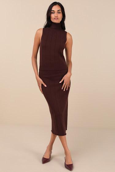 Double up on compliments in the Lulus Sophisticated Duo Brown Sleeveless Turtleneck Sweater Top! Soft and stretchy ribbed sweater knit shapes this cozy top, which features a chic turtleneck and a sleeveless bodice. The relaxed silhouette finishes with a banded hem. Pair with the matching skirt for a complete look!