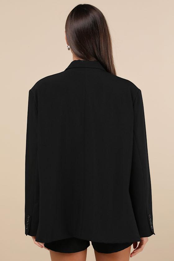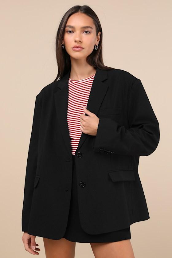 Dress up any look to perfection when you head out in the Lulus Sophisticated Era Black Oversized Blazer! Lightweight woven fabric shapes this versatile blazer with a notched collared neckline and long sleeves with lightly padded shoulders and decorative button cuffs. A faux welt pocket, functional twin flap pockets, and two button closures accent the oversized bodice.
