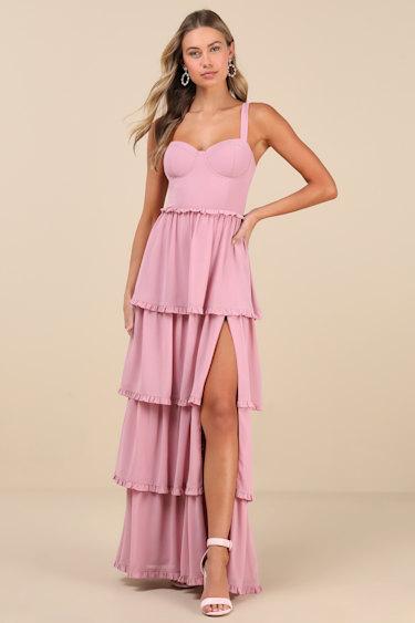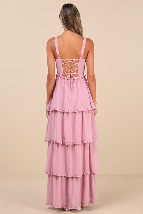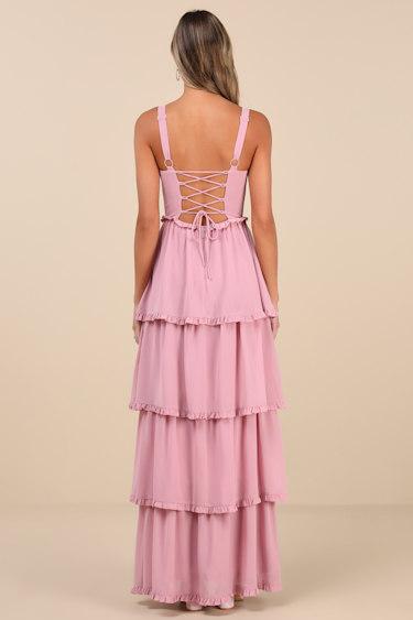 From springtime ceremonies to summer soirees, the Lulus Sophisticated Occasion Pink Bustier Lace-Up Maxi Dress is always ready to have you looking your best! Lightweight woven chiffon shapes this elegant dress that has wide, adjustable straps and a bustier-style bodice with a sweetheart neckline, supportive underwires, padded cups, and a ruffle-trimmed, fitted waist. Turn around to reveal a flirty lace-up back that will keep all eyes on you! Tiered skirt (with a thigh-high side slit) features tiers of ruffled trim as it falls to a maxi hem. Hidden zipper/clasp at back.