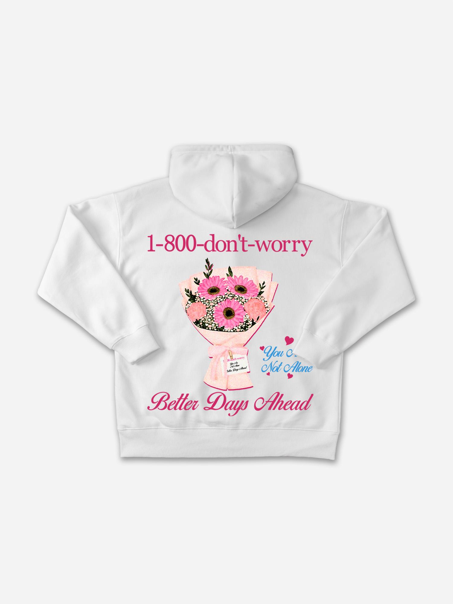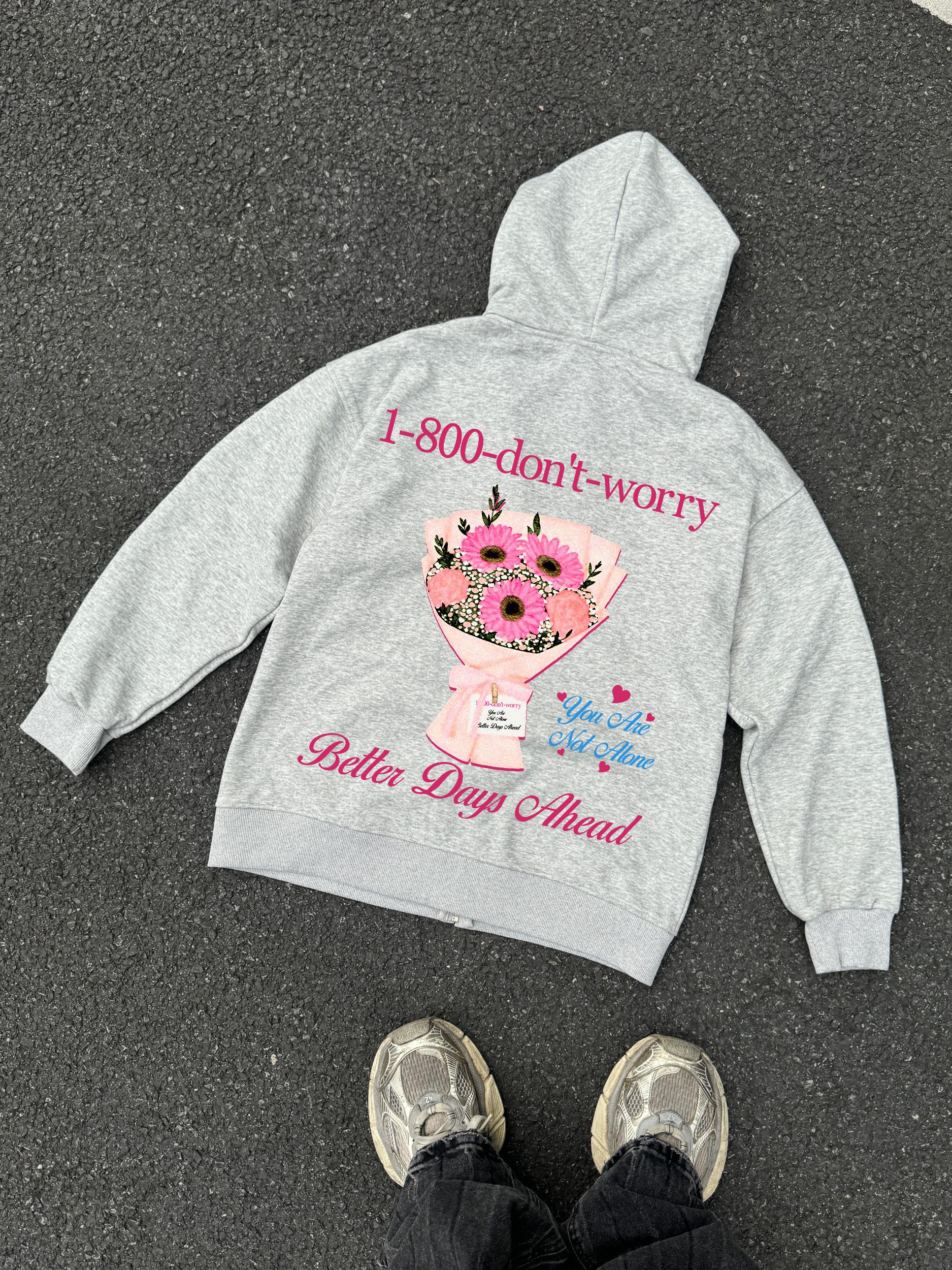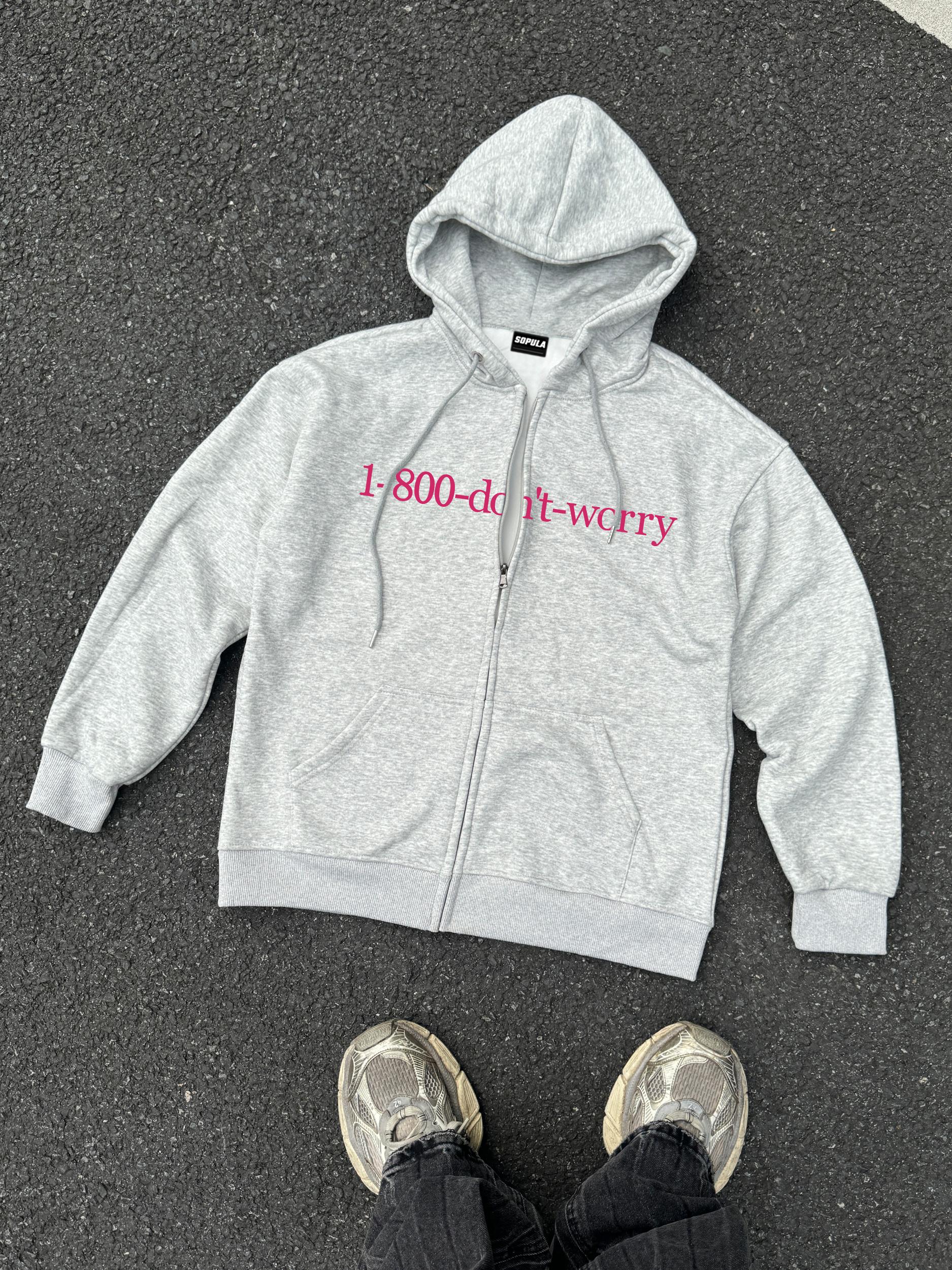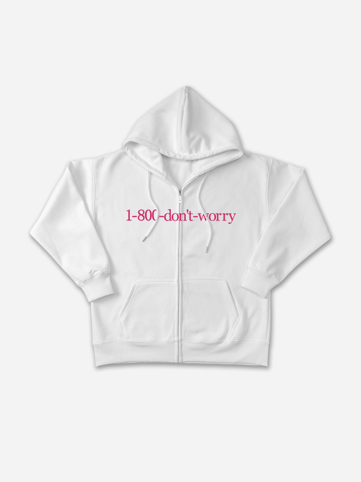 Shop Sopula 1-800-don't-worry Graphic Oversized Zip Up Hoodie at Sopula Clothing. SPU: CP-253597-HEX Fabric: 100% Cotton Fabric Weight: 450g Pattern: 1-800-don't-worry Graphic Process: Zipper Gender: Women,Men Season: Spring,Fall,Winter Size Range: S-3XL Color: White,Apricot,Flower Gray Print Position: Front,Back
