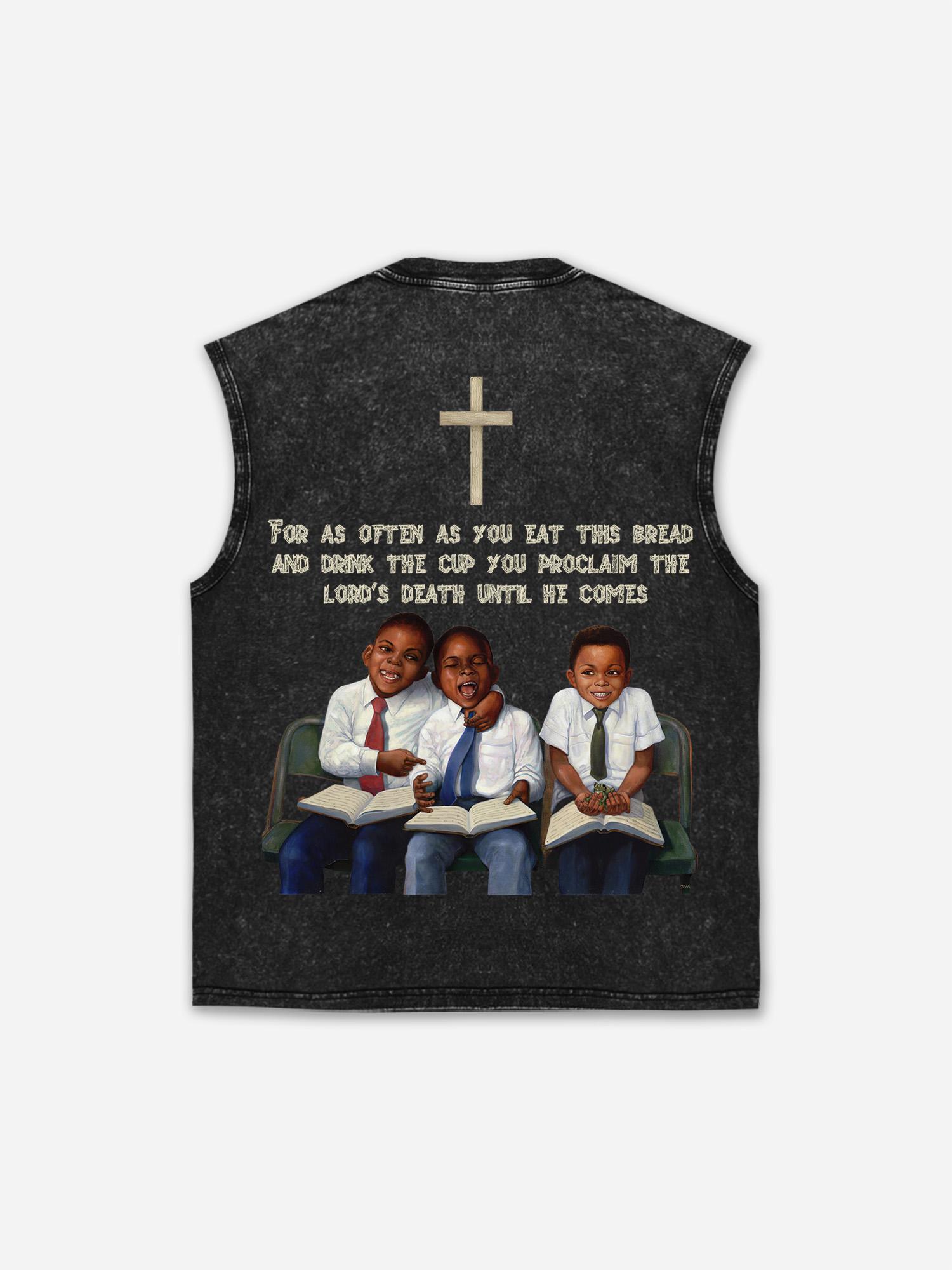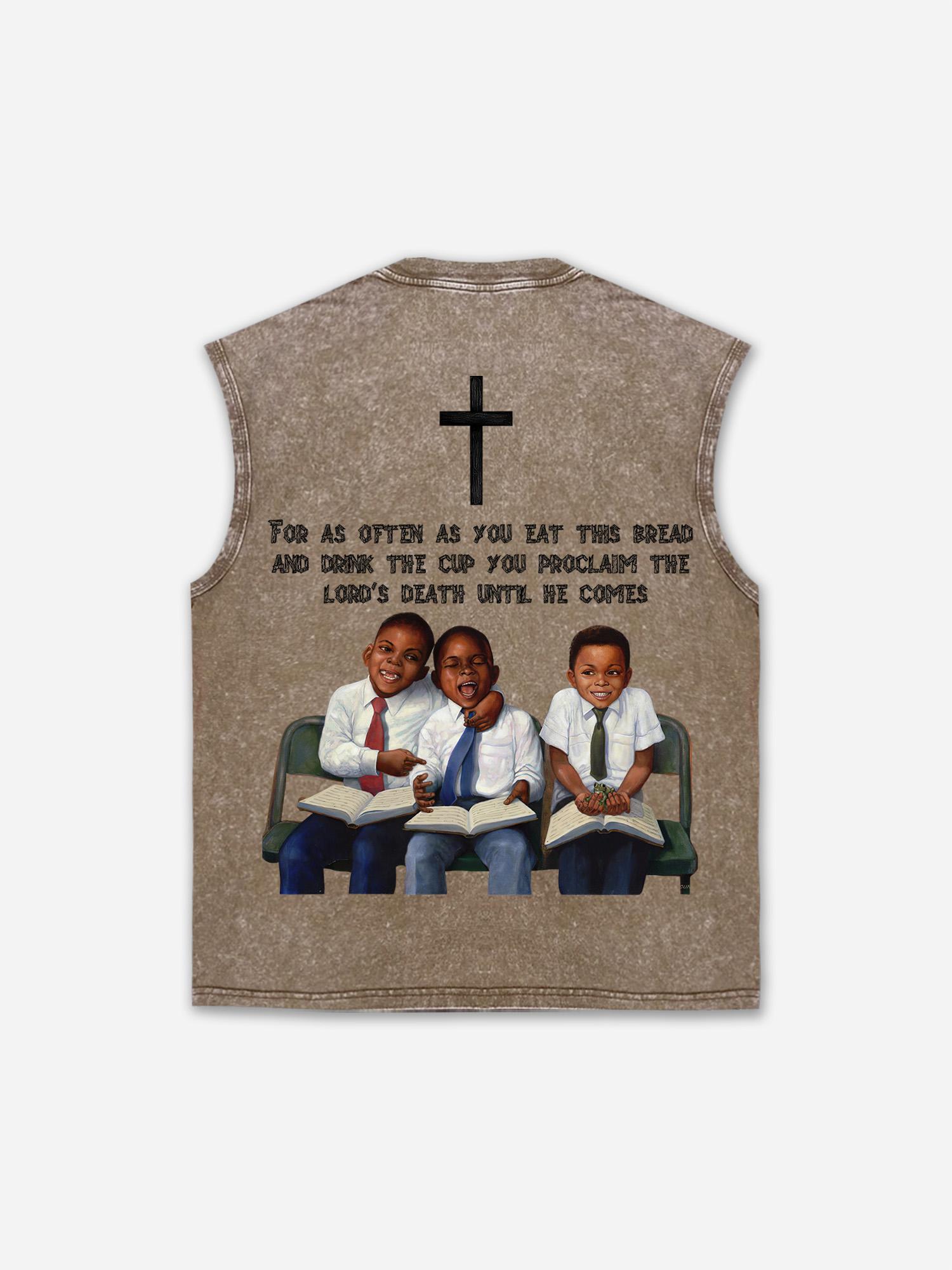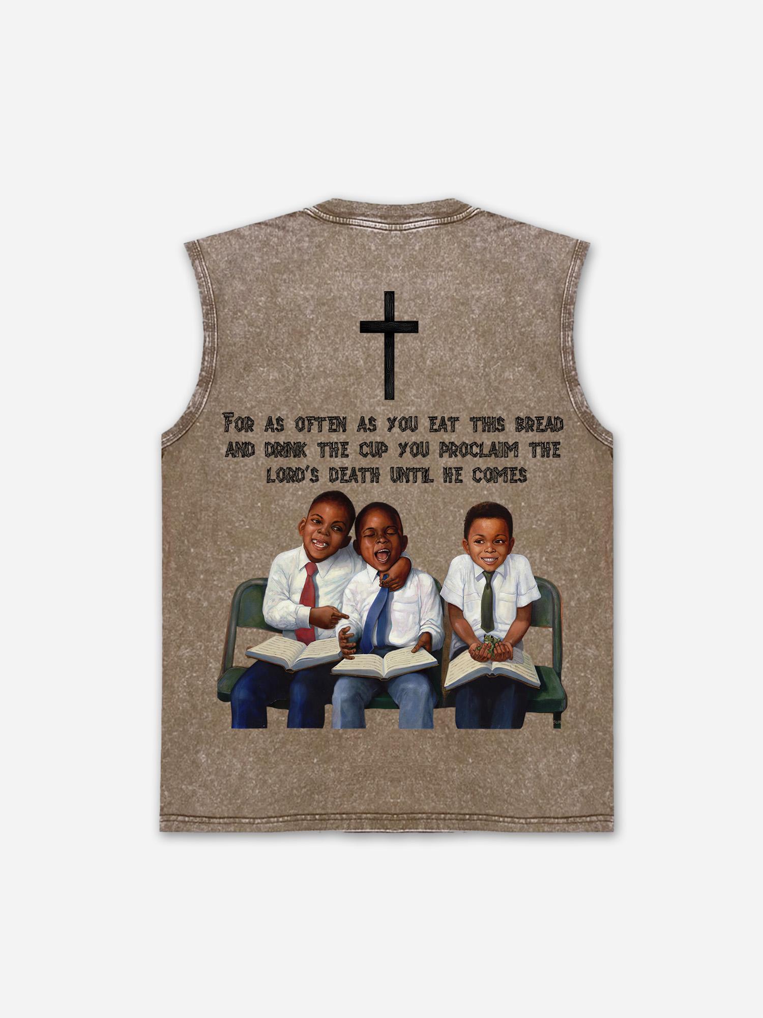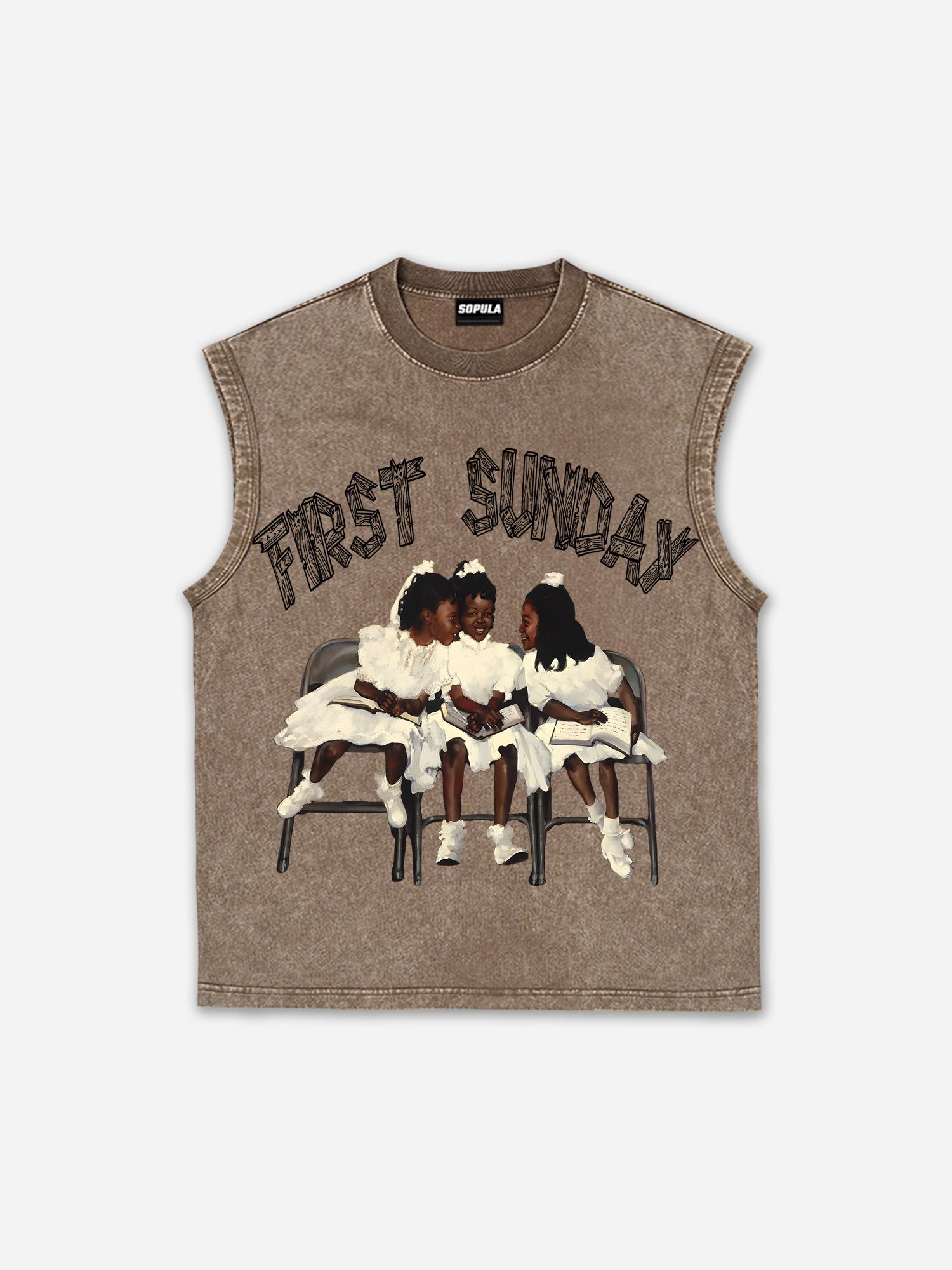 Retro First Sunday Graphic Wash Sleeveless Shirt Tank Top. SPU: CP-144384-HWE Fabric Name: 100% Cotton Wax-Dyed Fabric Pattern: First Sunday Faith Graphic Process: Printed Style: Retro Length: Regular Collar: Round Neck Popular Elements: Acid Washed Sleeve Type: Sleeveless Occasion: Daily Theme: Summer