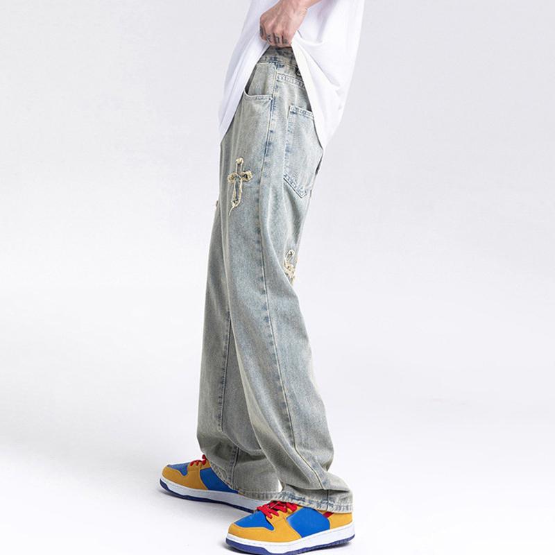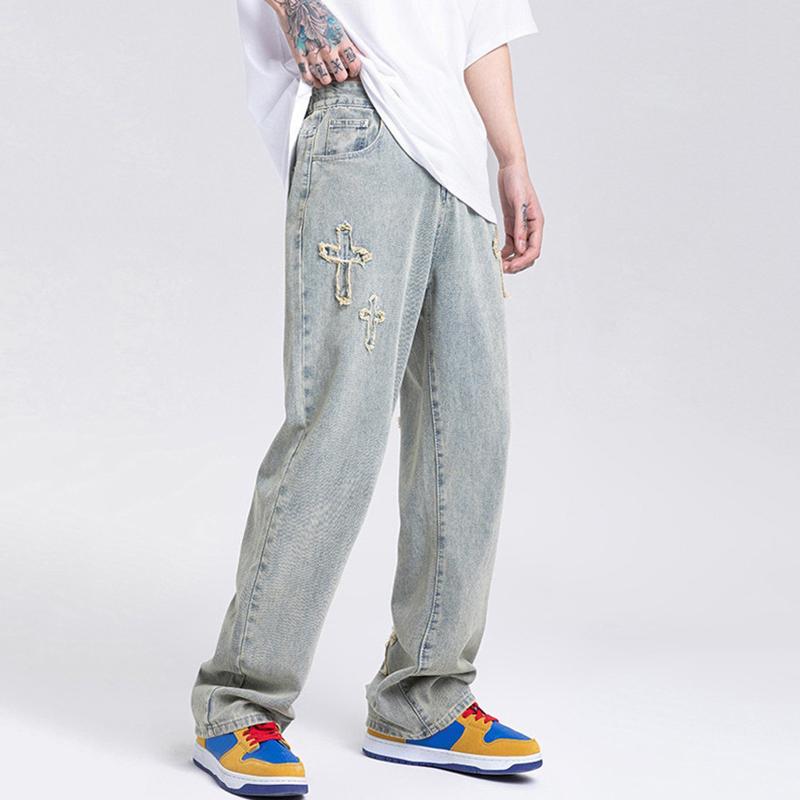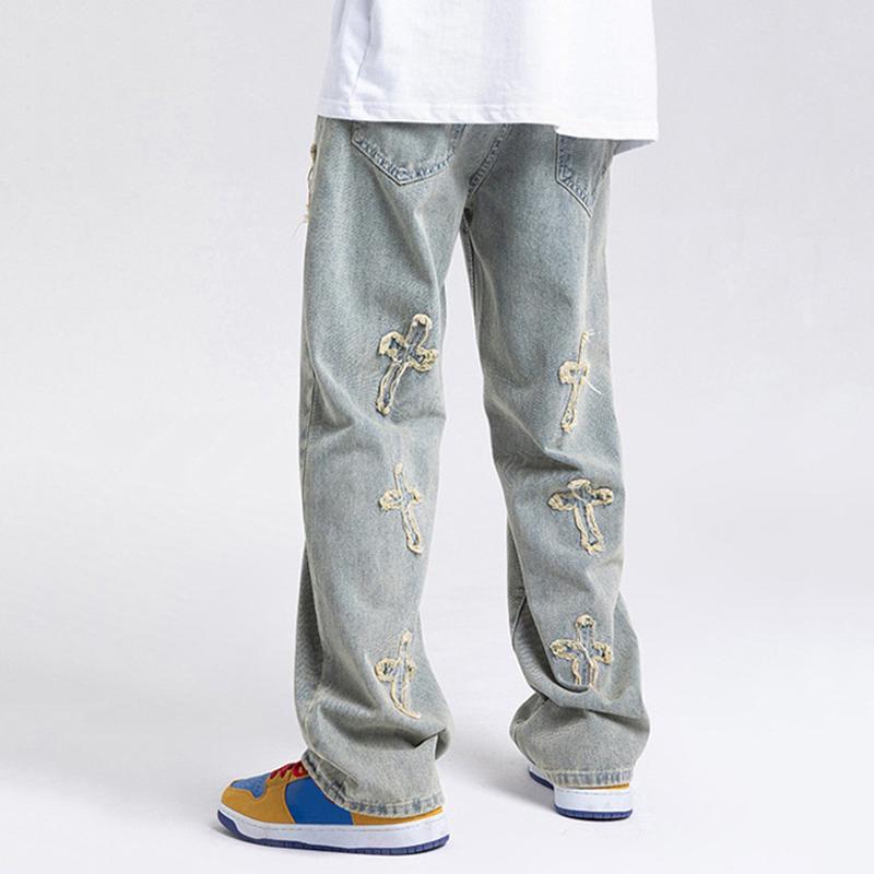 Sopula Unisex Men's Hip Hop Retro Ins Cross Embroidered Washed Jeans. SPU: XH-170918-HYG Fabric Name: 50% Cotton-50% Spandex Pattern: Cross Process: Embroidered Style: Hip Hop Length: Long Popular Elements: Washed, Embroidered Occasion: Daily, Street Theme: All Seasons Size Waist Hip Length cm inch cm inch cm inch S 65 25.4 96 37.4 99 38.6 M 69 26.9 100 39.0 99 38.6 L 73 28.5 104 40.6 101 39.4 XL 77 30.0 108 42.1 103 40.2 2XL 81 31.6 112 43.7 105 41.0 3XL 85 33.2 116 45.2 107 41.7 Due to manual measurement, there may be an error of 1-3cm