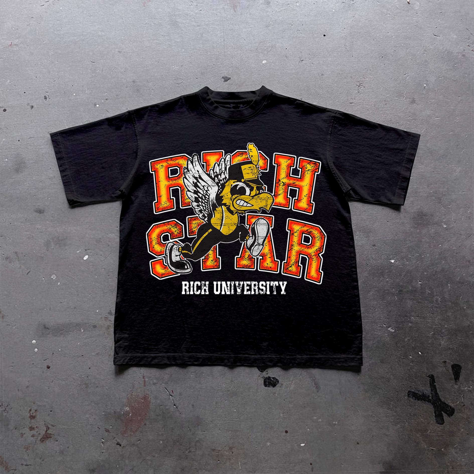 SPU: CP-159400-WCX Fabric Name: 100% Cotton Pattern: Rich Star Graphic Process: Printed Style: Vintage Length: Regular Collar: Round Neck Popular Elements: Rich Star Graphic Sleeve Type: Short Sleeve Occasion: Street, Daily Theme: Summer
