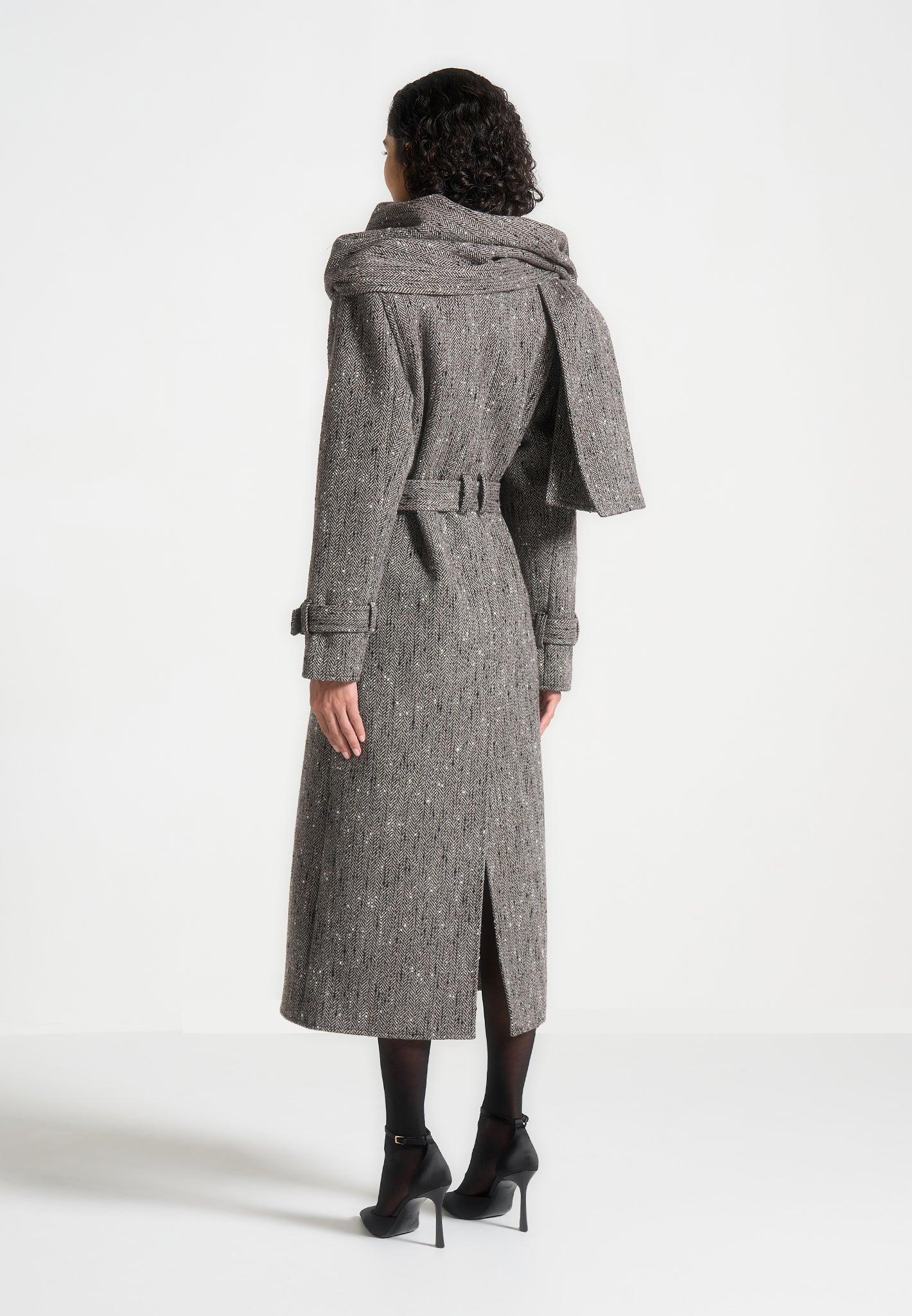 This longline coat delivers a sleek, elongated silhouette with timeless appeal. Designed with classic lapels and structured shoulder epaulettes, it brings a tailored finish to outerwear. The detachable scarf adds versatile styling and extra warmth, while an adjustable belt defines the waist for a personalised fit. Buckle cuff detailing introduces both refinement and function, completing a coat that balances elegance with practicality. Longline coat silhouette for a sleek, elongated look Detachable scarf for versatile styling and added warmth Buckle cuff detailing for a refined, functional accent Adjustable belt for personalised waist definition Shoulder epaulettes for a structured, elevated touch Classic lapels for a timeless tailored finish Tonal Manière De Voir vegan leather Eiffel to centre back