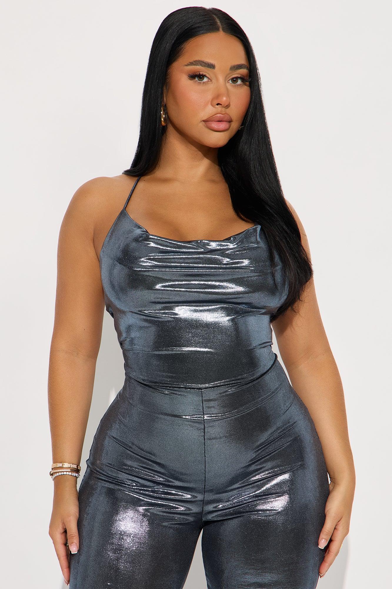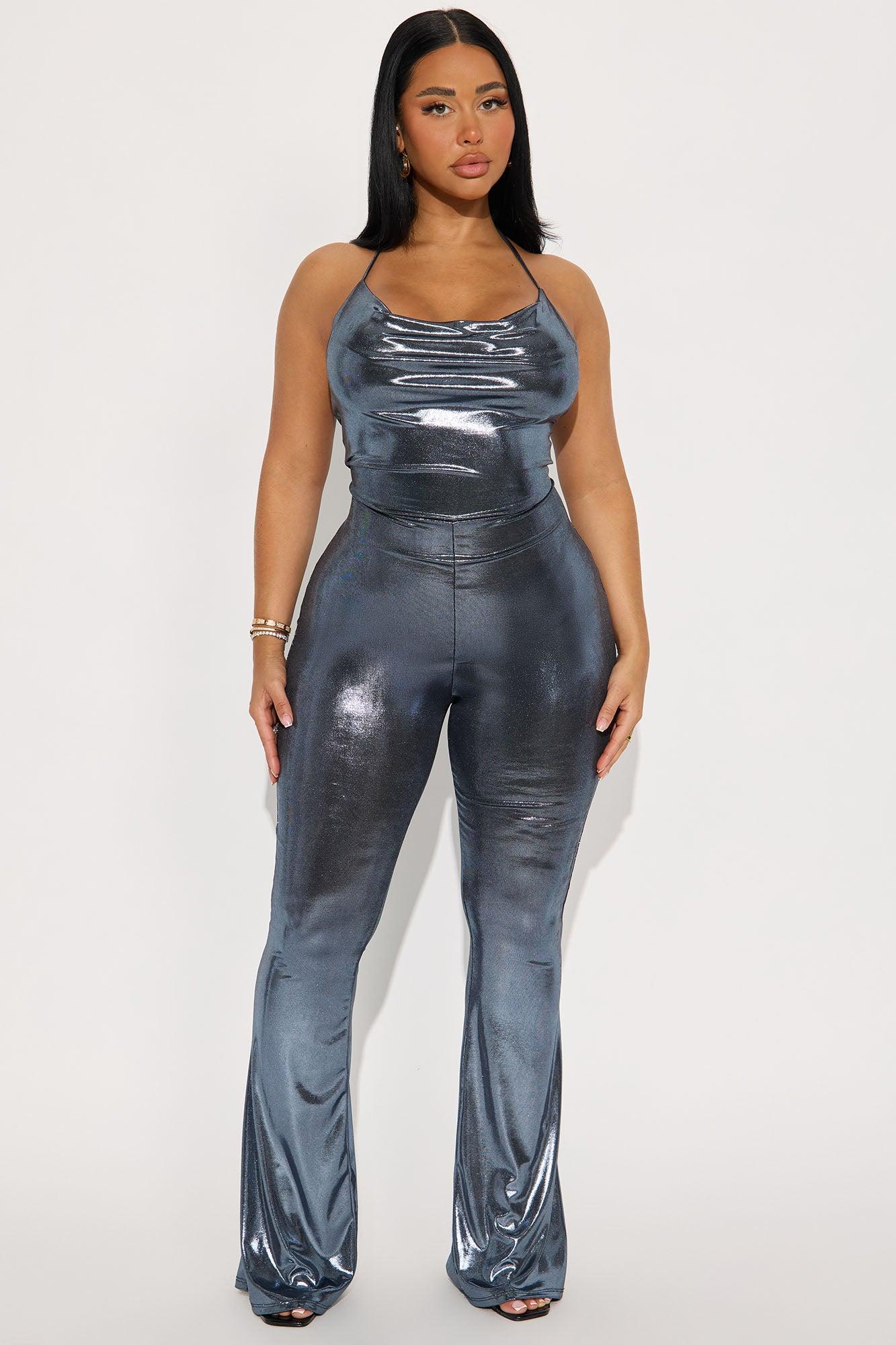 Soraya Metallic Cowl Neck Flare Jumpsuit - Slate Blue Female