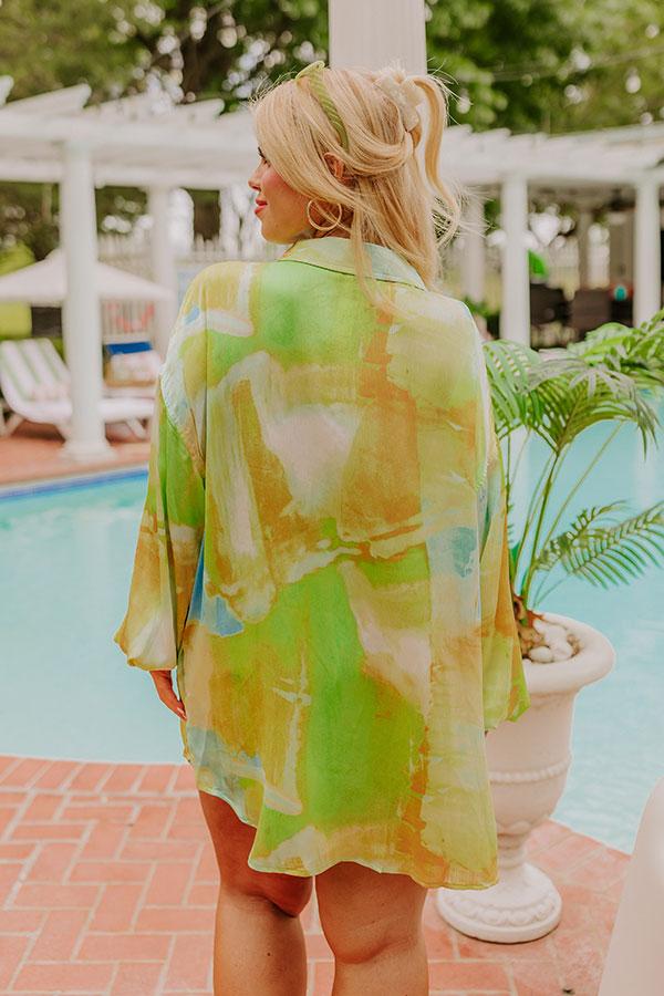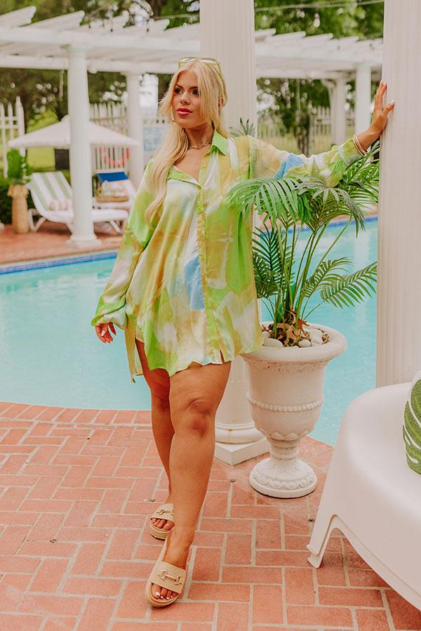 - Stay styled to shine with this luxe satin button up! - Unlined material with a green, yellow, and blue hued marble print and a satin finish - A collared neckline - Long sleeves with button closure cuffs - A relaxed silhouette that ends in a curved hemline with side slit accents Measurements 1XL : Bust 54", Hip 54", Length 31", Sleeve Length 21.5", Waist 54". 2XL : Bust 56", Hip 56", Length 32", Sleeve Length 22.5", Waist 56". 3XL : Bust 60", Hip 60", Length 33", Sleeve Length 23", Waist 60".