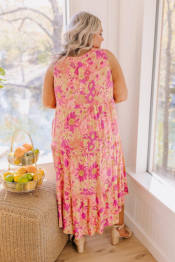 - Sip under the sun in this beautiful dress! - Unlined material with a pink, yellow, and purple hued floral print - A v-cut neckline with a tie detail and a ruffled back - A sleeveless cut - A relaxed silhouette that ends in a ruffled high-low hemline