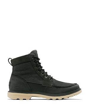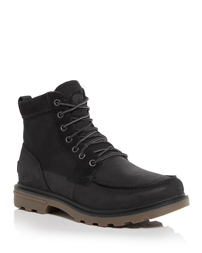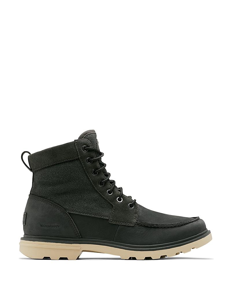 Features of the Sorel Men's Carson Moc WP Boot Carson collection extends the reach of SOREL capability in men's utility for the street and beyond Upper: Combination waterproof full grain leather and suede with waterproof canvas shaft Textile lining Seam-sealed waterproof construction Laces Are not waterproof Footbed: Removable die-cut TPU foam with textile topcover Outsole: Molded rubber Rubber welt detail