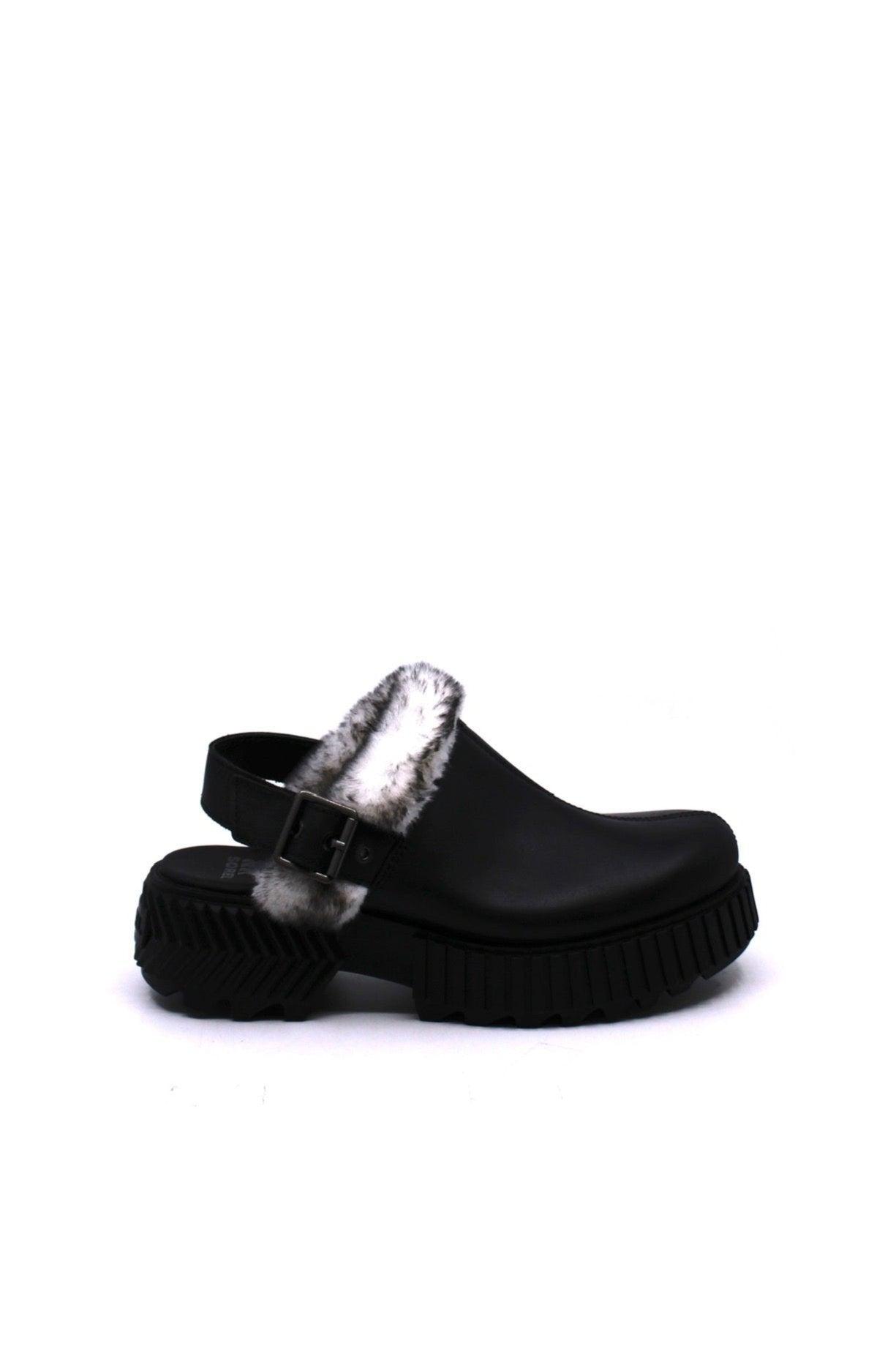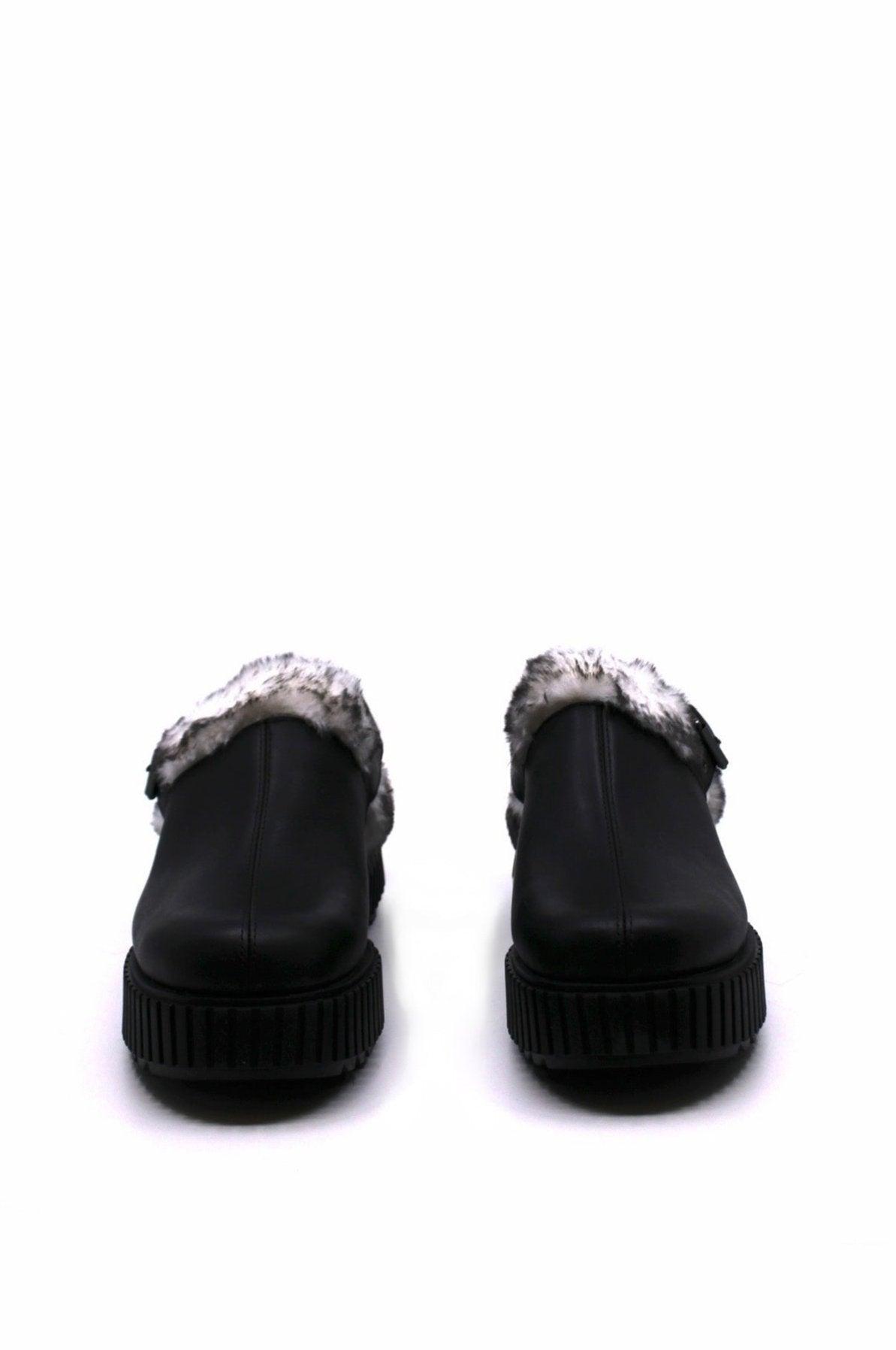 UPPER: Waterproof full grain leather. Adjustable ankle strap with buckle closure. Faux fur trim. Textile lining.
