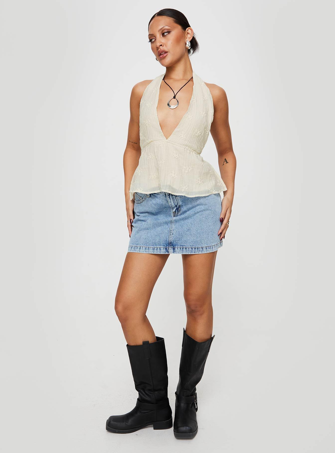 Halter top V neckline, open back, drawstring fastening at back Non-stretch material, fully lined Princess Polly Lower Impact Main: 100% reclaimed polyester, Lining: 100% reclaimed cotton Cold hand wash