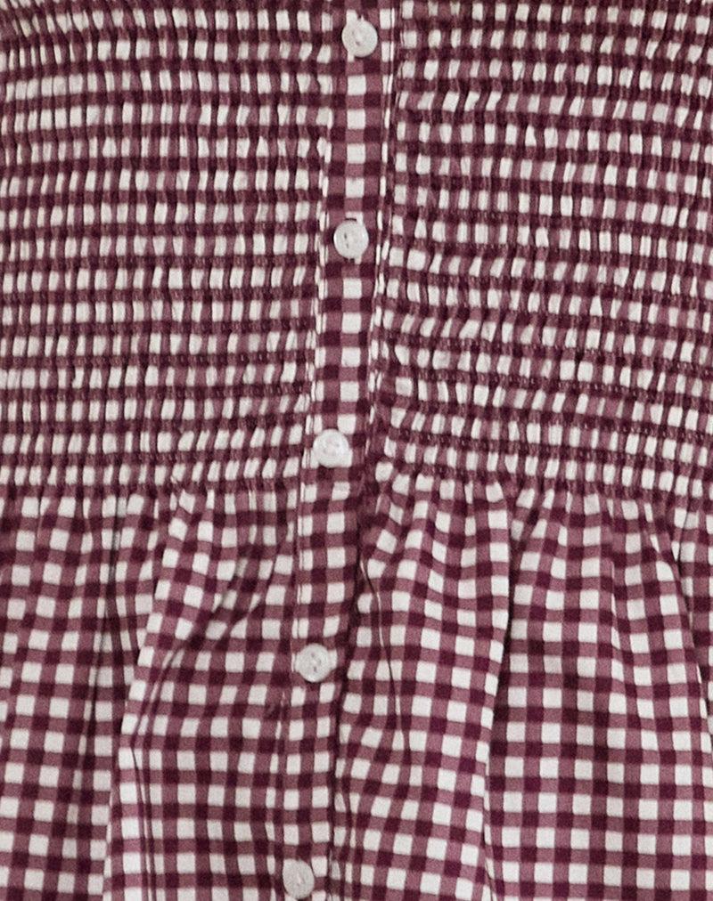 The Soter bandeau top in mini gingham wine on a poplin fabric base. Featuring a full shirred body, slim fit and functional button placket finished with a peplum hemline. Complete the look with our denim skirt. MODEL WEARS SIZE:EXTRA SMALL - MODEL HEIGHT:5'7