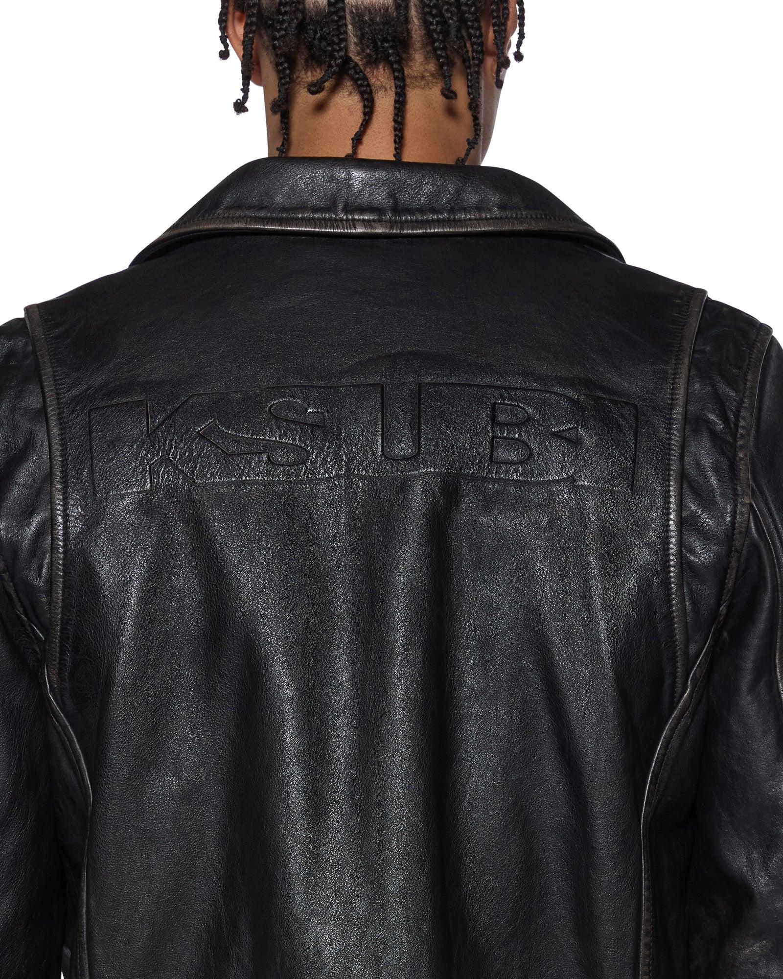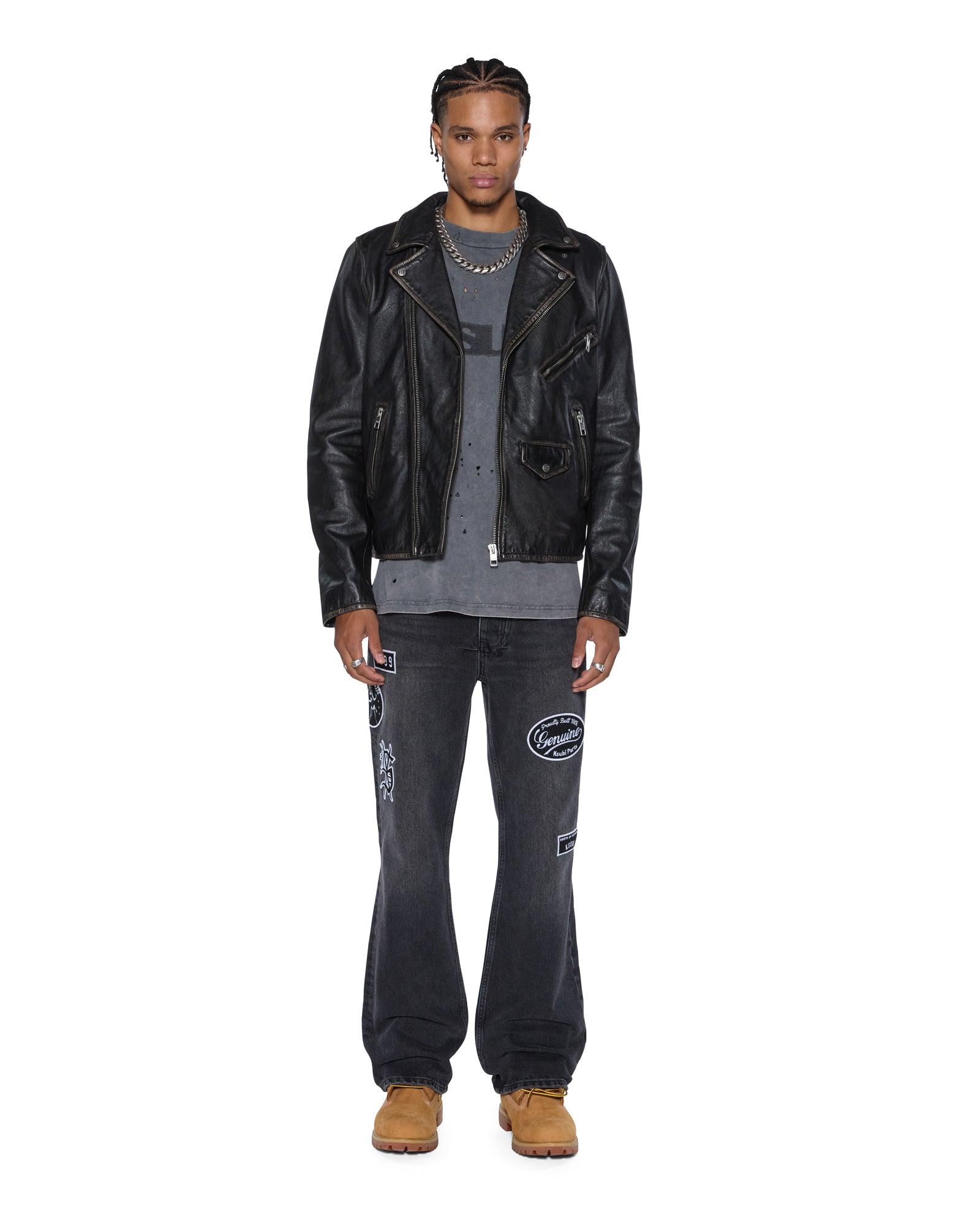 The Sott Capitol Leather Jacket Black is a regular fit traditional biker jacket with a metal zip-up closure, cut from pebbled aged leather. It features classic biker construction details including exposed zippers, functional pockets, and back sleeve vents, finished with a debossed Sign of the Times logo across the back, signature T-box riveted branding, and Ksubi branded hardware.