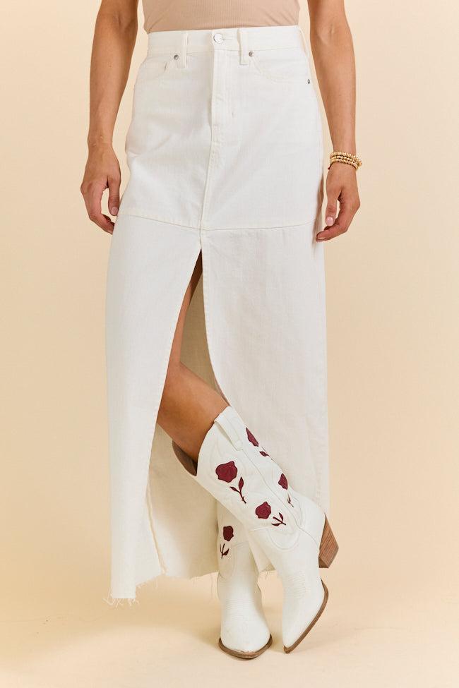 Details White Denim Midi Skirt Fabric has no stretch Button zipper closure, functional pockets Unlined Size small from waist to hem: 40" Material and Care Machine wash cold, line dry Patterns may vary Materials may have natural variations Colors may vary from different viewing devices.