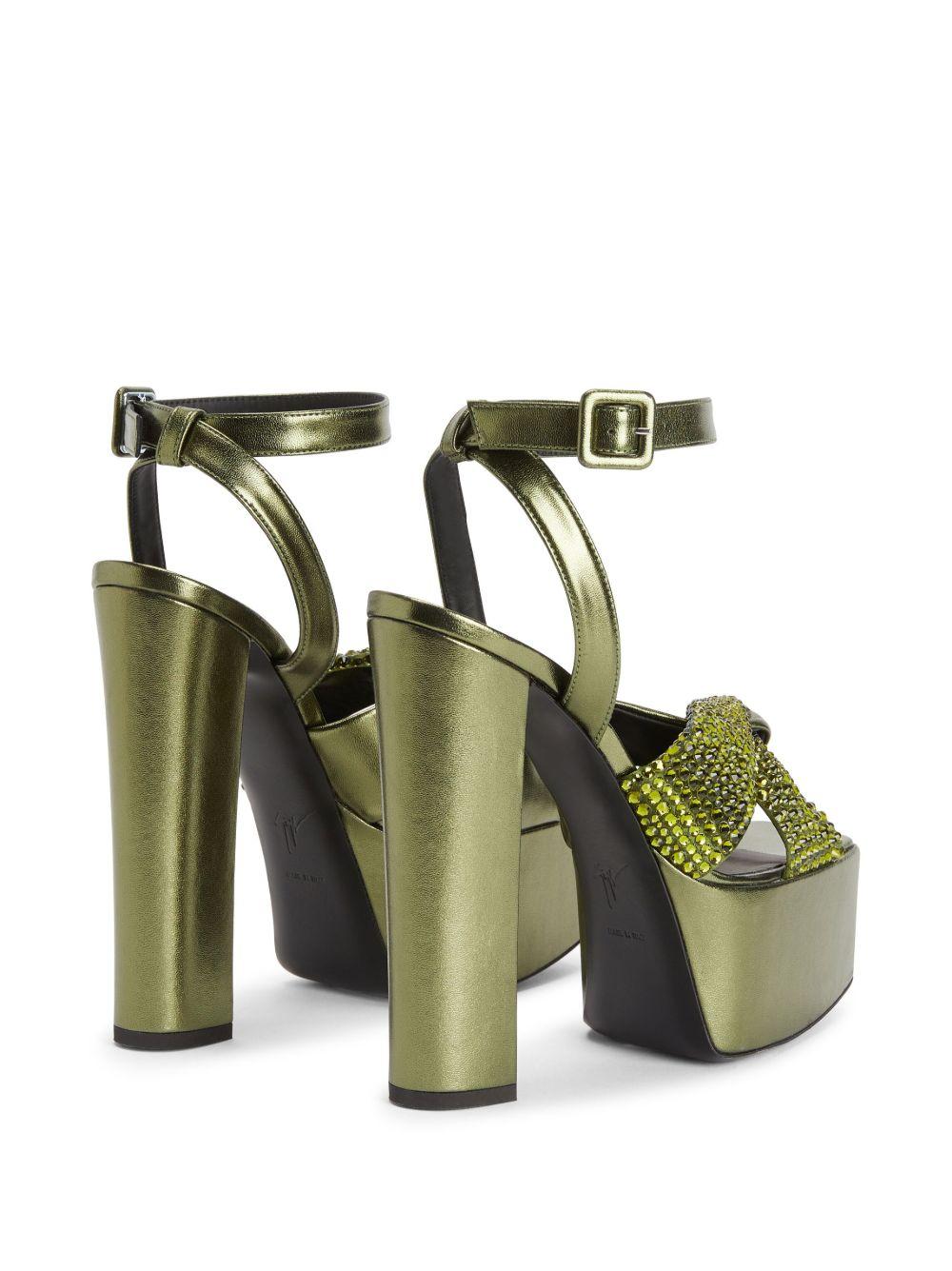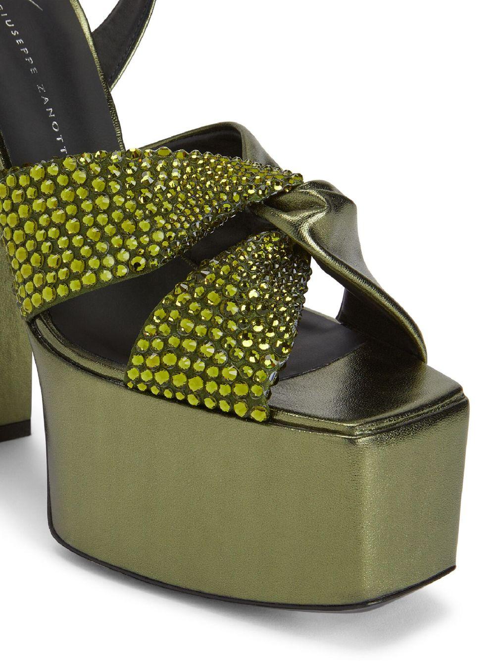 Giuseppe Zanotti Souree 150mm crystal-embellished sandals | Green | green | leather | crystal embellishment | crossover strap at the toe | open toe | buckle-fastening ankle strap | branded insole | 150mm block heel | platform sole | Fabric/Satin/Leather/Rhinestone | Heeled Sandals | Sandals | Shoes | Women