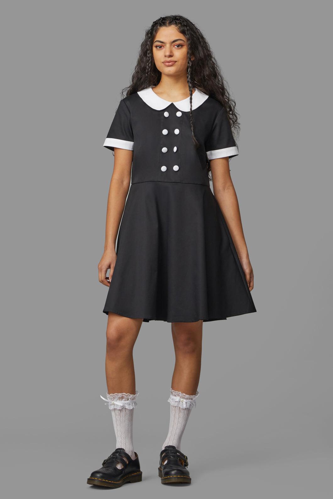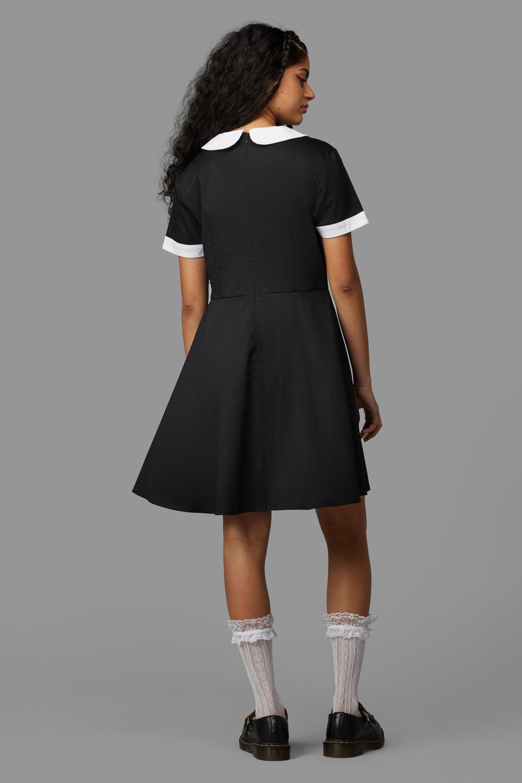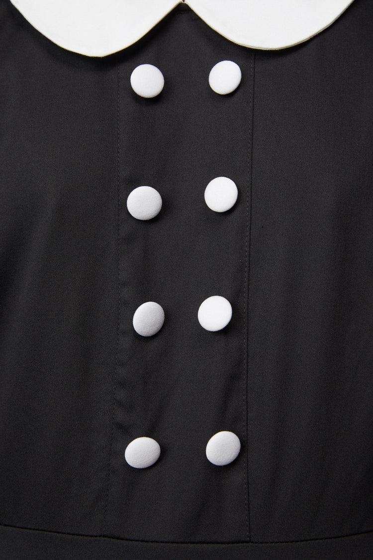 The Sourpuss Dress by Black Friday is a chic skater-style dress that perfectly combines a fitted bodice with a playful flared skirt. This dress features short sleeves and a classic collar at the neckline, adding a touch of vintage-inspired charm. The decorative button detail on the front enhances its retro appeal, while the zip closure at the back ensures a secure fit.Crafted from woven cotton with a slight stretch, the Sourpuss Dress offers both comfort and style. The fabric provides a structured yet comfortable fit, making it suitable for various occasions, from casual outings to special events.Fabric & Care:Material: 98% Cotton, 2% ElastaneCare Instructions:Cold machine washDo not bleach or soakDo not wring or spinDo not tumble dryCool iron on reverse if required