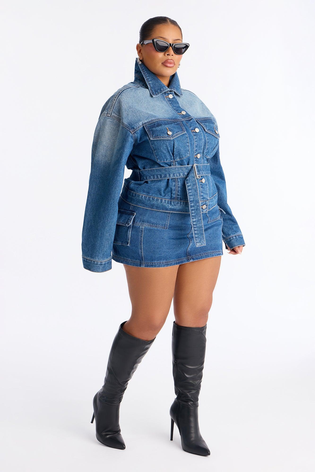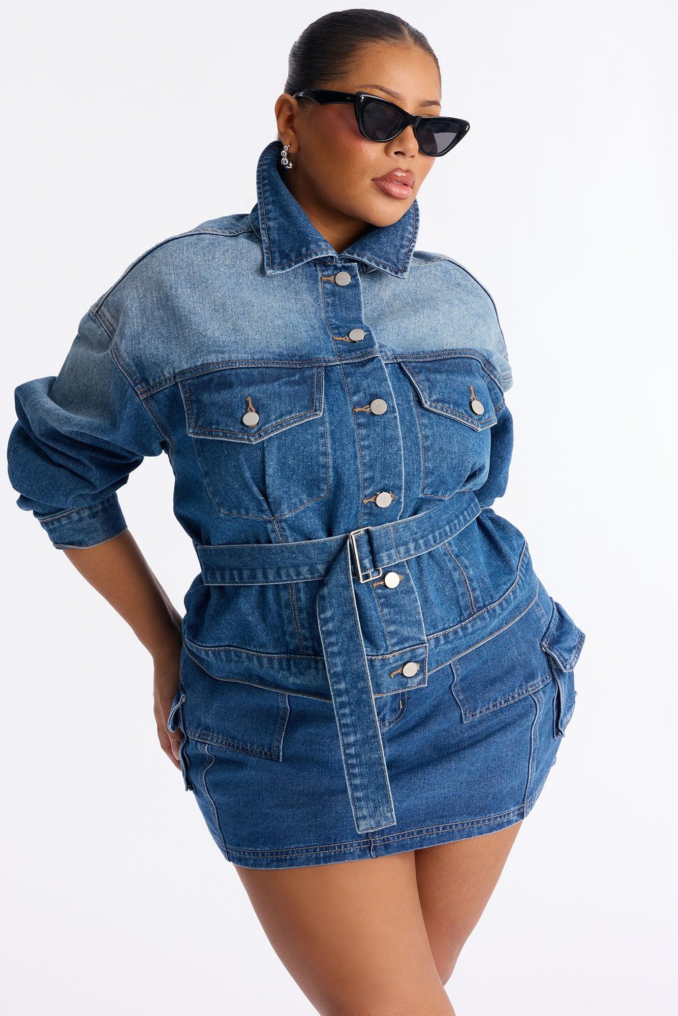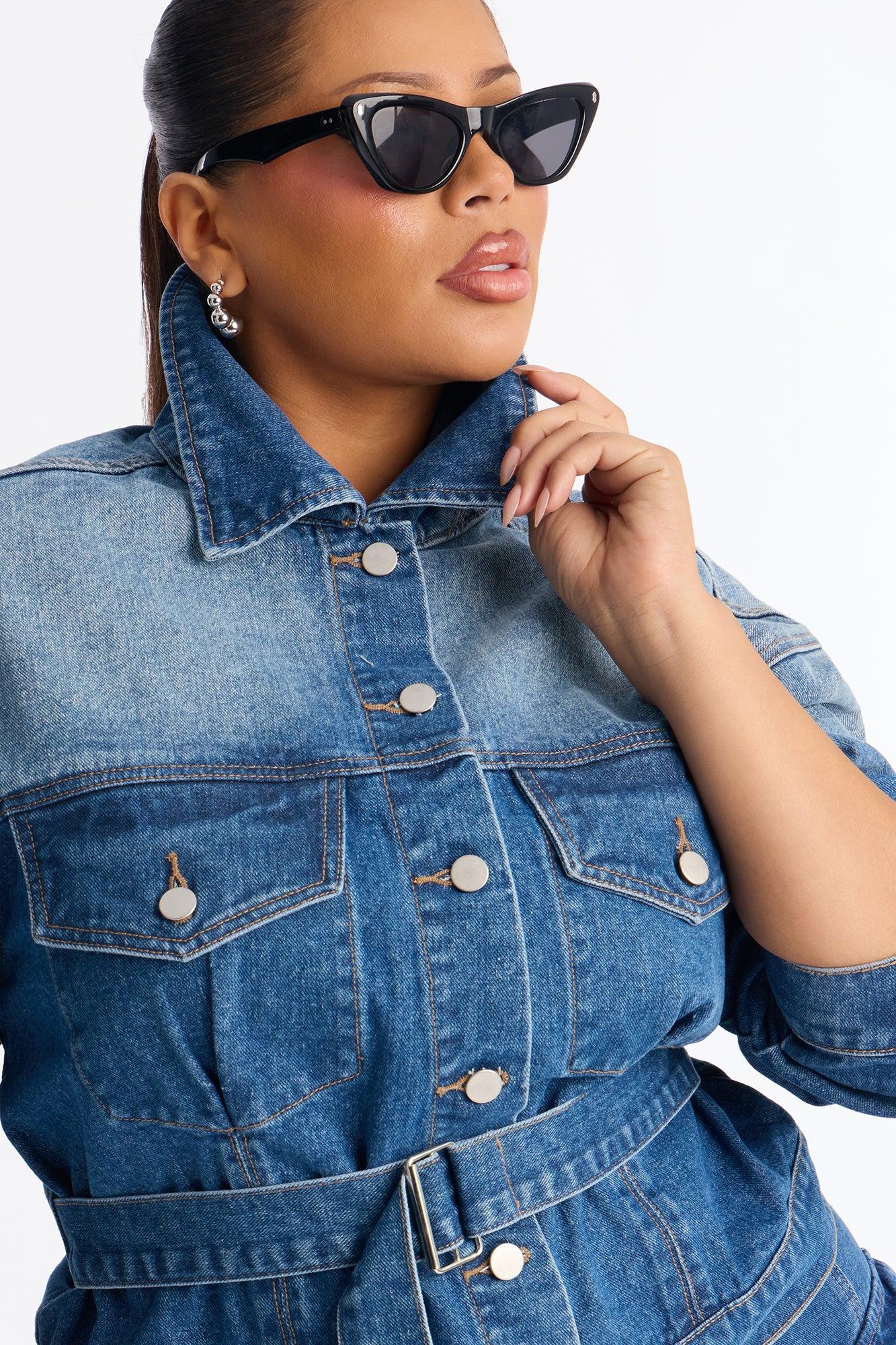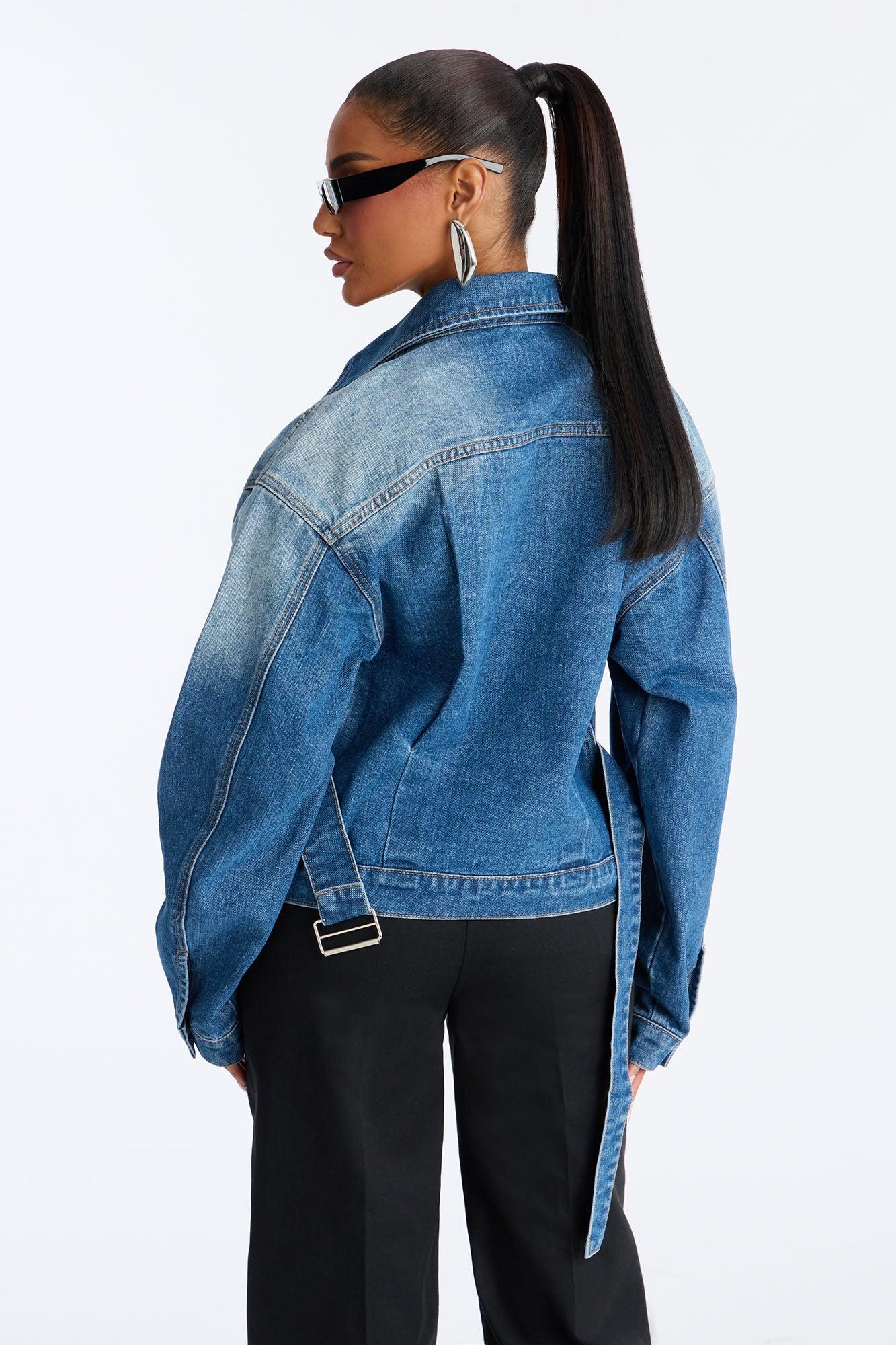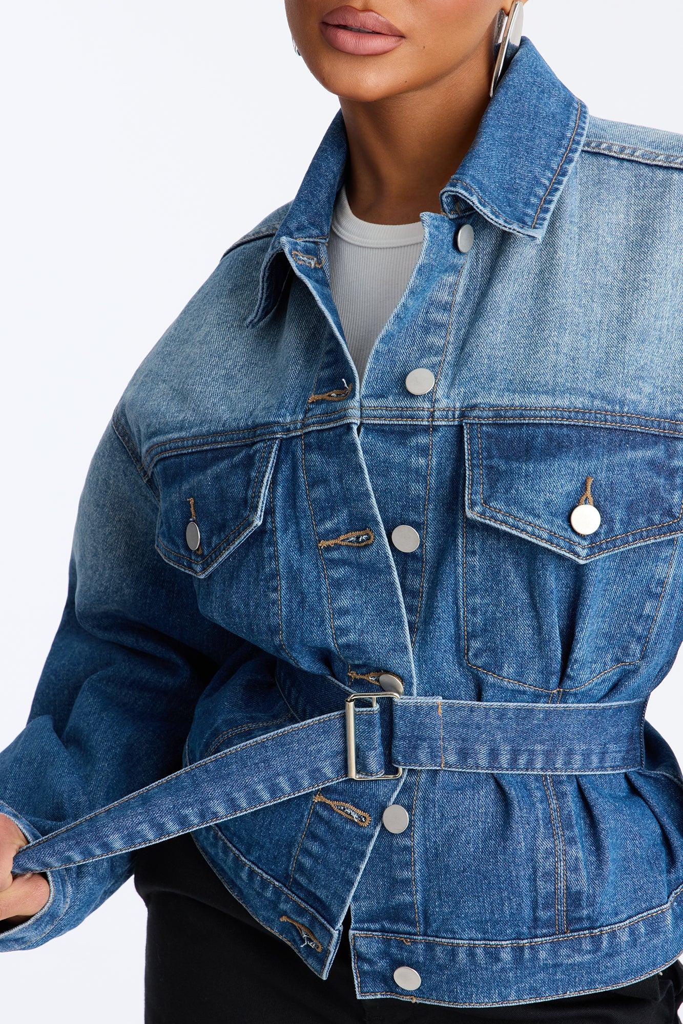 Available In Medium Wash. Denim Jacket Collar Front Chest Pockets Button Closure Belted Non Stretch Disclaimer: Due To The Specialized Wash Process, Each Garment Is Unique. Self: 100% Cotton Imported California Proposition 65WARNING: Cancer and Reproductive Harm - www.P65Warnings.ca.gov.