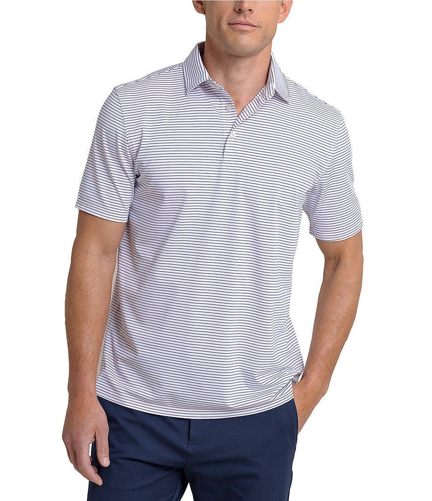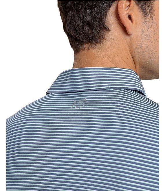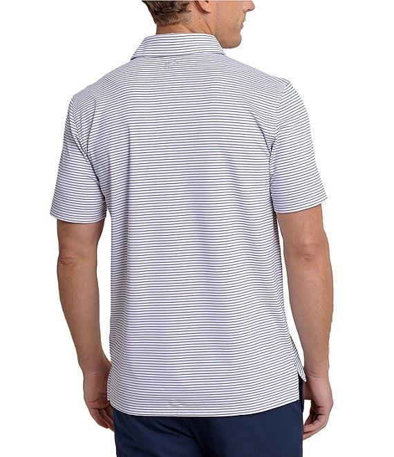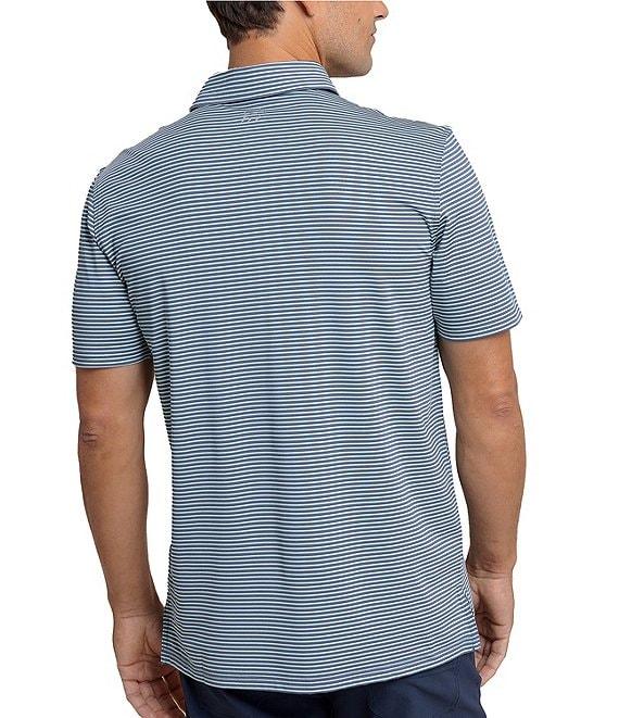 From Southern Tide, this polo shirt features: Thin, horizontal stripe pattern Polo collar with internal collar stays Outline Skipjack heat seal on the back neck 3-button placket Branded imitation mother-of-pearl buttons Short sleeves Droptail hem Moisture wicking UV protection Stretch fabric Recycled polyester/spandex Machine wash/tumble dry Imported.