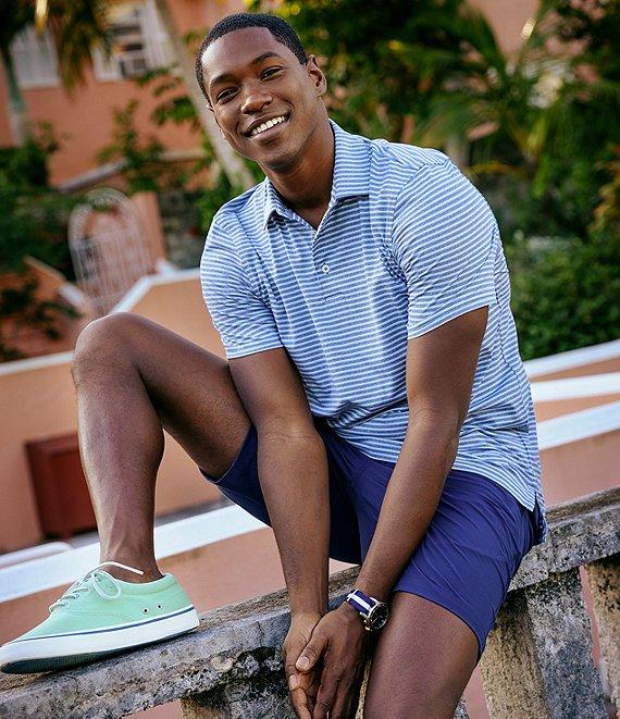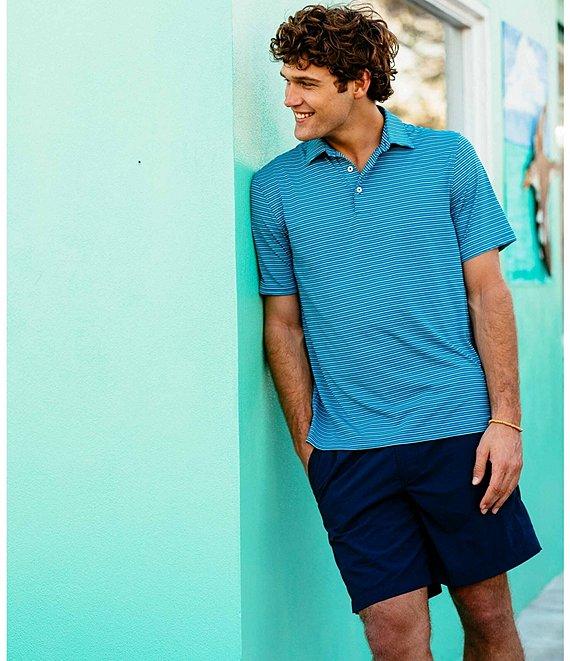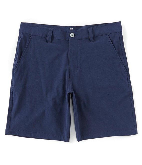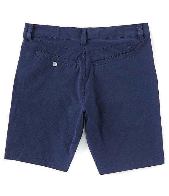 From Southern Tide, these shorts feature: flat front solid tone coil zipper with rubber-coated Skipjack button closure mesh pocketing one button closure back pocket on left, other is open 2" self-fabric on bottom of front pockets for extra security Skipjack embroidery above right-hand back pocket T3 heat transfer main label at back interior waistband quick dry; moisture-wicking 9" inseam 4-way stretch cotton/polyester/spandex machine wash; tumble dry Imported.