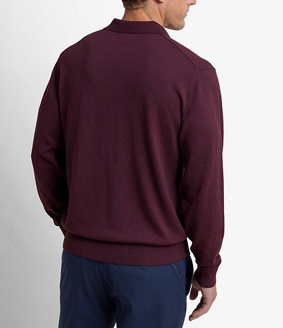 From Southern Tide, this polo shirt features: 2-piece ribbed polo collar Long sleeves with ribbed cuffs 3-button placket with medium brown faux horn buttons Tonal outline Skipjack embroidery on the left chest Contrast color at under placket and back side of front placket Ribbed hem Cooling materials Cotton/recycled polyester Machine wash/tumble dry Imported.