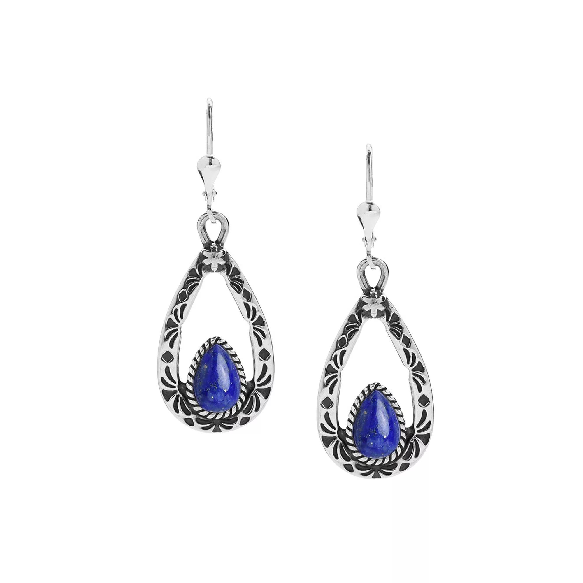 Add a little Southwest flair to your outfit of the day with these sterling silver and stone drop earrings from Southwest Spirit. Click on this JEWELRY & WATCHES GUIDE to learn about fit, styles, materials and more! Add a little Southwest flair to your outfit of the day with these sterling silver and stone drop earrings from Southwest Spirit. Click on this JEWELRY & WATCHES GUIDE to learn about fit, styles, materials and more! FEATURES Earring size: 46 mm x 16 mm x 4 mm Closures: leverback Nickel free Metal: sterling silver Finish: polished Packaging: velvety pouchSTONE DETAILS Stone: turquoise, lapis Center stone weight: 2 1/5 ct. Center stone size: 9 mm x 6 mm Shape: pear Setting: bezel, prong Gemstones may have been treated to enhance their appearance. Special care may be required. Please visit our Gemstone Treatment & Special Care Guide for more information. Size: One Size. Color: Blue Lapis. Gender: female. Age Group: adult.