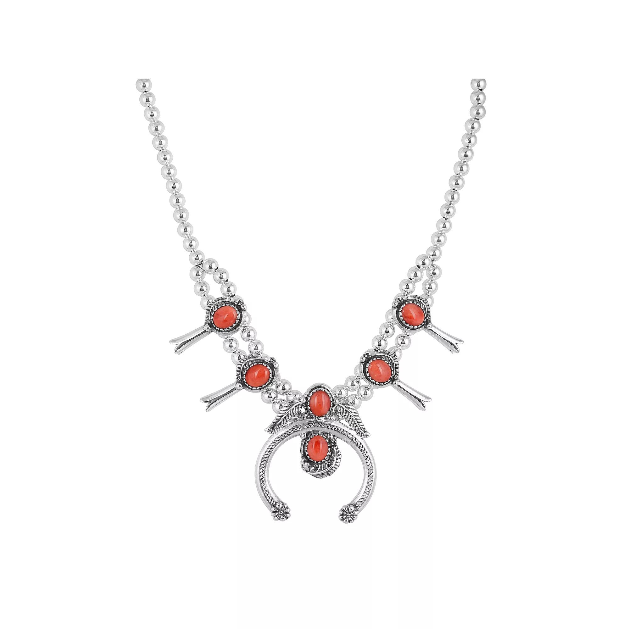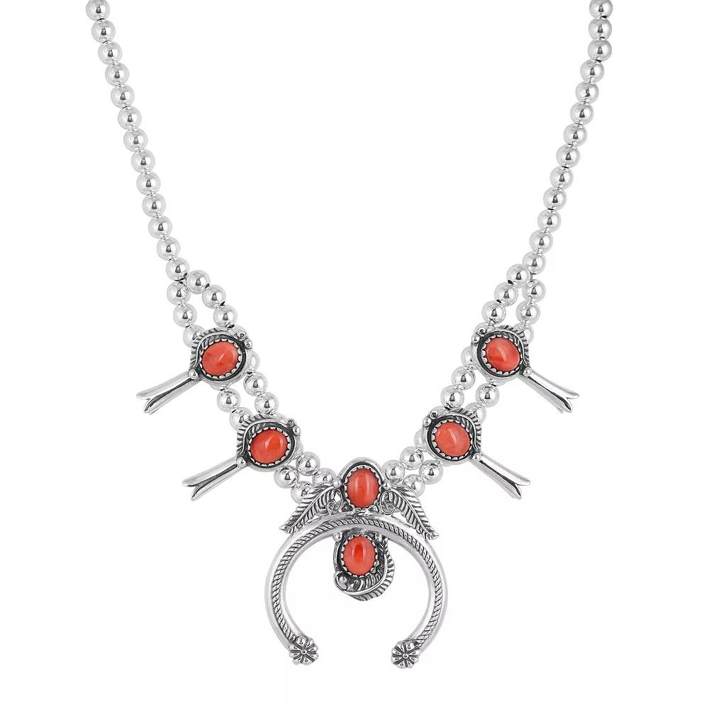 Add a little Southwest flair to your outfit of the day with this sterling silver and stone squash blossom necklace from Southwest Spirit. Click on this JEWELRY & WATCHES GUIDE to learn about fit, styles, materials and more! Add a little Southwest flair to your outfit of the day with this sterling silver and stone squash blossom necklace from Southwest Spirit. Click on this JEWELRY & WATCHES GUIDE to learn about fit, styles, materials and more! FEATURES Drop length: 53 mm Chain length: 16-19 adjustable Chain type: bead Clasp: lobster-claw Nickel free Metal: sterling silver Finish: polished Packaging: velvety pouchSTONE DETAILS Stone: red spiny oyster, lapis Center stone size: 10 mm x 8 mm Shape: oval Setting: bezel Gemstones may have been treated to enhance their appearance. Special care may be required. Please visit our Gemstone Treatment & Special Care Guide for more information. Size: 17. Gender: female. Age Group: adult.