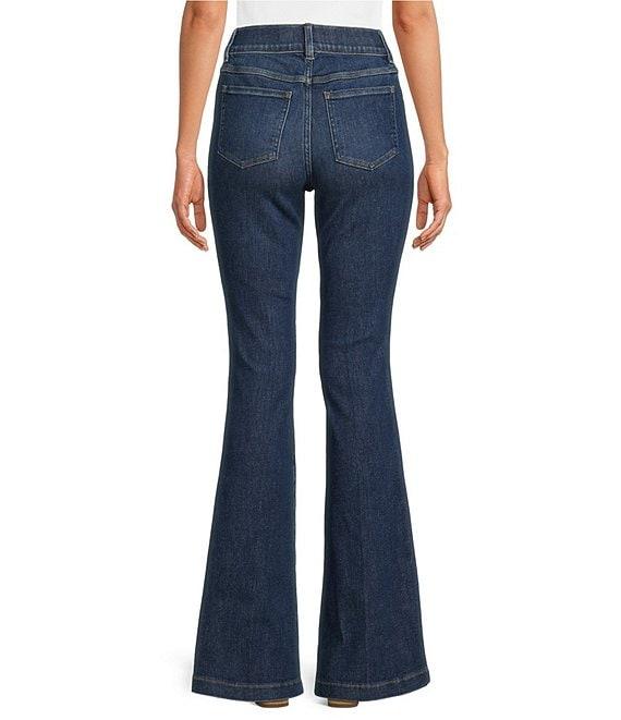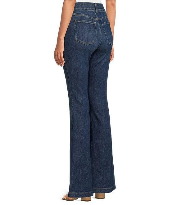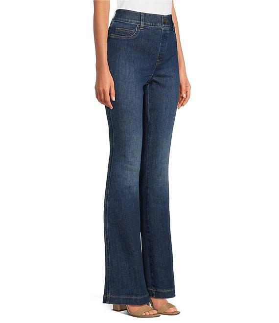 From Spanx, these flare leg jeans feature: Structured stretch fabrication for easy movement & comfort Flare leg High rise Hits at the natural waist for great coverage (& no muffin top!) Fitted through hip & thigh with a flared leg Faux side pockets The Slim is Built In® – hidden Gut Check shaping panel targets the tummy Pull-on construction for less bulk & a completely flat front Approx. 34" regular inseam; 10.5" flare leg opening Body: cotton/polyester/lycra® elastane; lining: polyester/cotton Machine wash/tumble dry Imported.