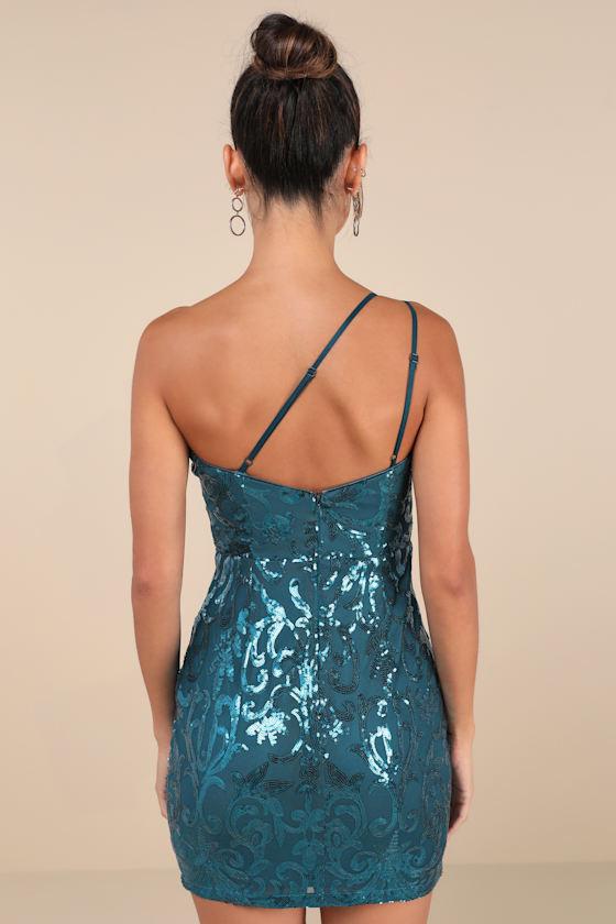It's time to get on the dancefloor and shine all night long in the Lulus Sparkling Persuasion Teal Blue Sequin One-Shoulder Mini Dress! Glittering sequins create an intricate pattern across stretchy mesh knit as it shapes a one-shoulder neckline (with hidden no-slip strips) and a princess-seamed bodice, all supported by dual, adjustable spaghetti straps. High, fitted waist tops a figure-flattering bodycon skirt with a flirty mini hem. Hidden back zipper/clasp.