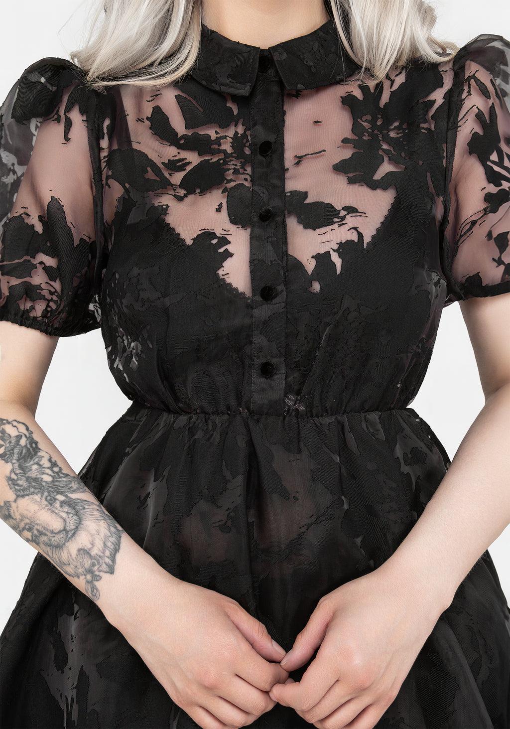 Babe wake up, a new Ghost Outfit just dropped - Black floral devore organza mini shirt dress - Flattering fit ‘n’ flare shape with a dramatic triple-layered mini-length skirt - Dainty collar & short puff sleeves for snappy styling - Functional buttoned placket on bodice features black velour domed buttons - Gloriously sheer floral devore organza fabric with tulle skirt layer to add volume - Burnout floral design adds a ghostly imprinted design - Layer with bralets, bodysuits, or slip dresses for a little more coverage - If you’re gonna spend an eternity wearing one thing... make it *this dress* Main: 100% polyesterContrast: 100% polyamide