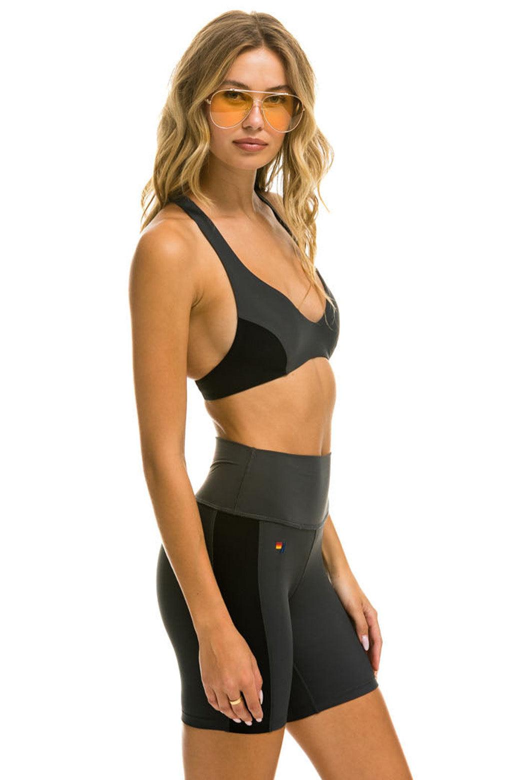 These bike shorts are perfect for riding in the studio or out on the trails. Our High-Waist Speed Short makes a perfect transition from a cycling class to the street with all-day wear sculpting and a cool side stripe to accentuate the body's natural curves. Pair it with our matching color block bralette to complete the look. Machine wash cold with like colors. Tumble dry low; low iron. Do not use chlorine bleach. Do not dry clean. Fabric: - 78% Polyamide (Recycled) - 22% Elastane - Handmade in LA with imported materials Additional fabric features: Recycled yarn, thermal protection, shape retention, UV protection & two-way stretch.