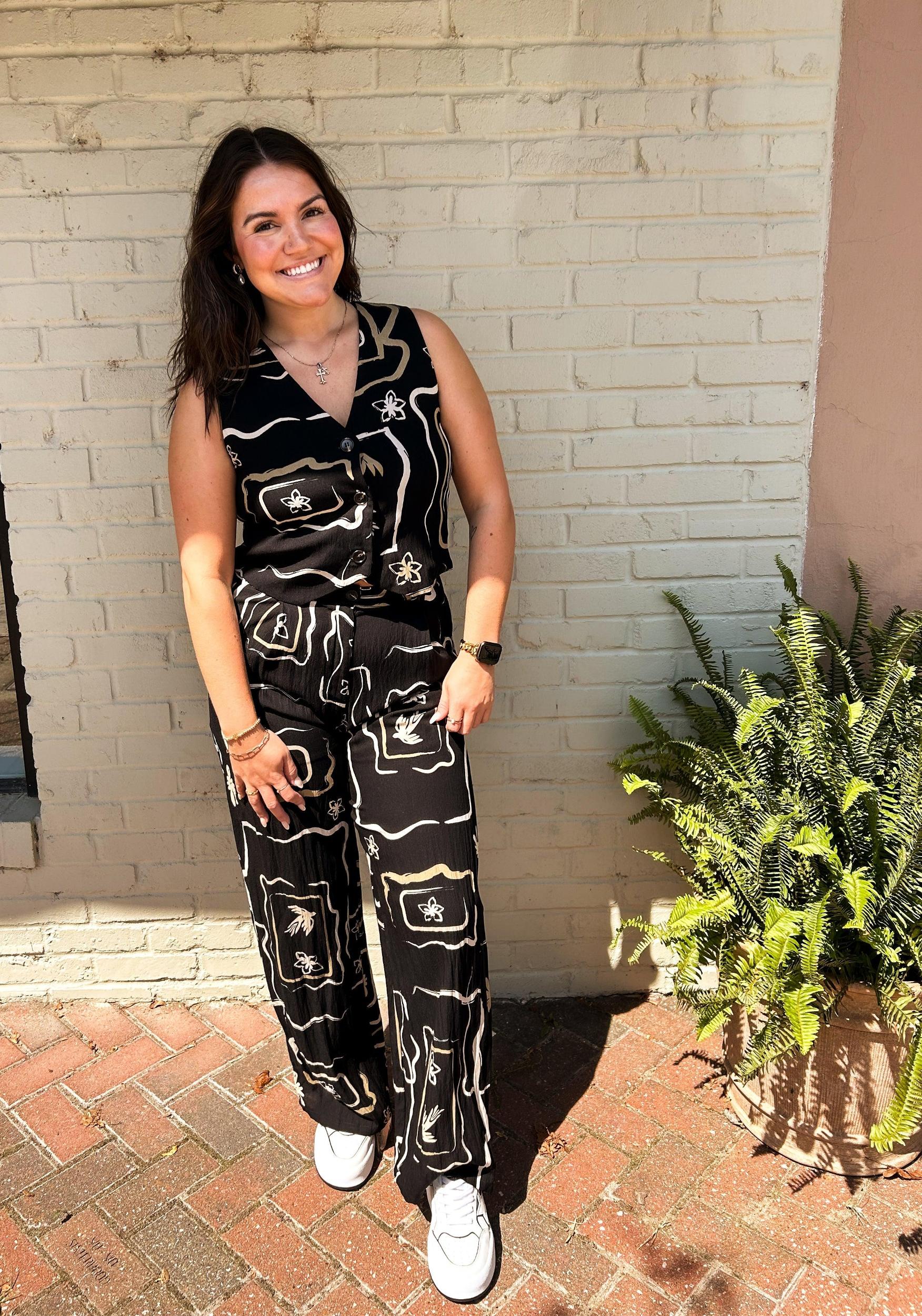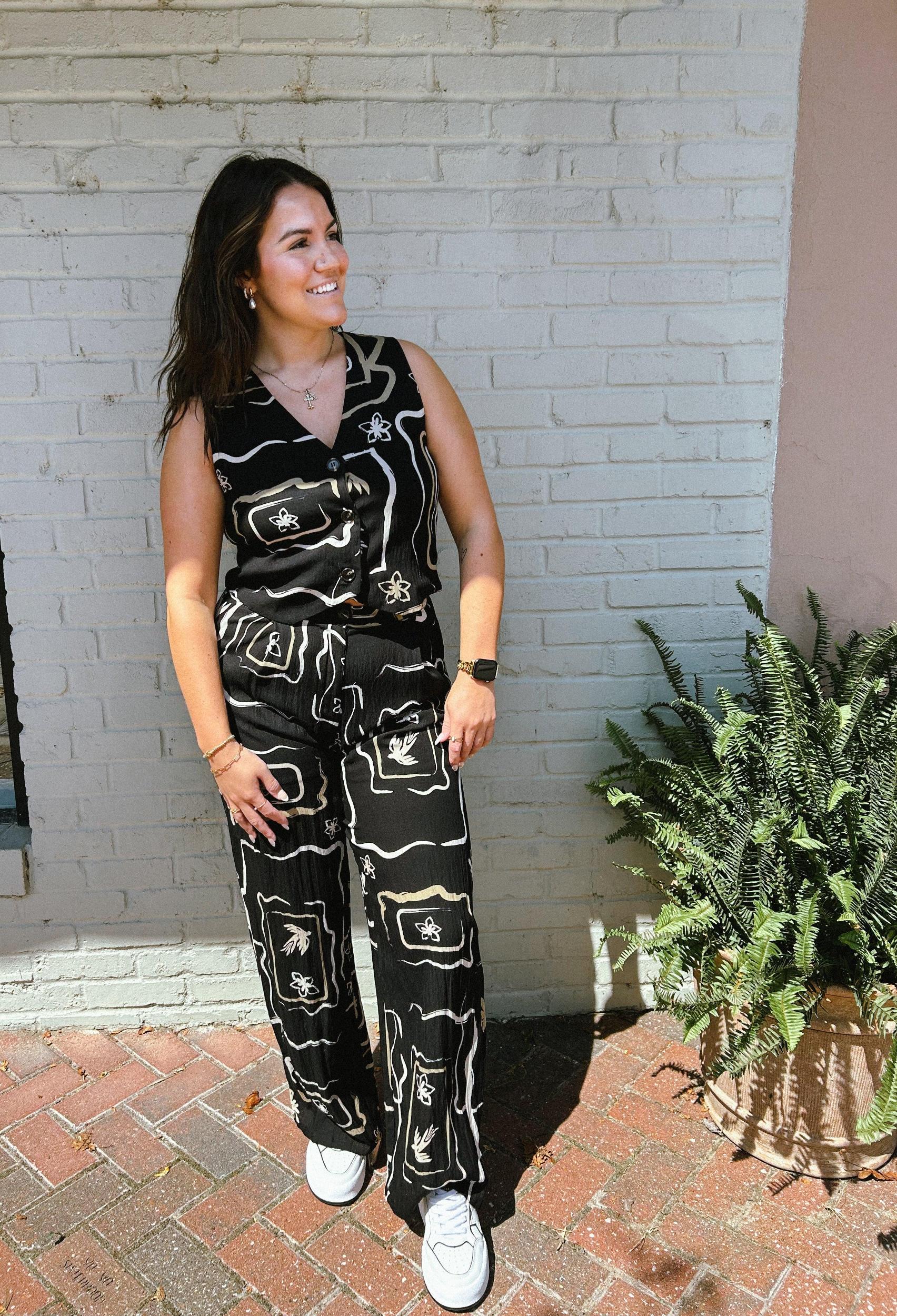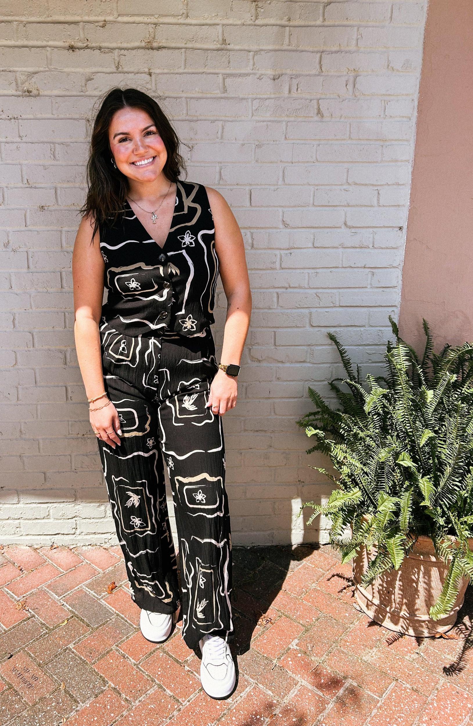 Turn heads in the playful Spencer Printed Vest & Pant Set! With a vibrant print, button down vest, and trendy pointed hem, this set is perfect for any occasion. The wide pants feature slant hip pockets, a pleated waist, and button and zip closure. Don't miss out on this unique and stylish outfit!