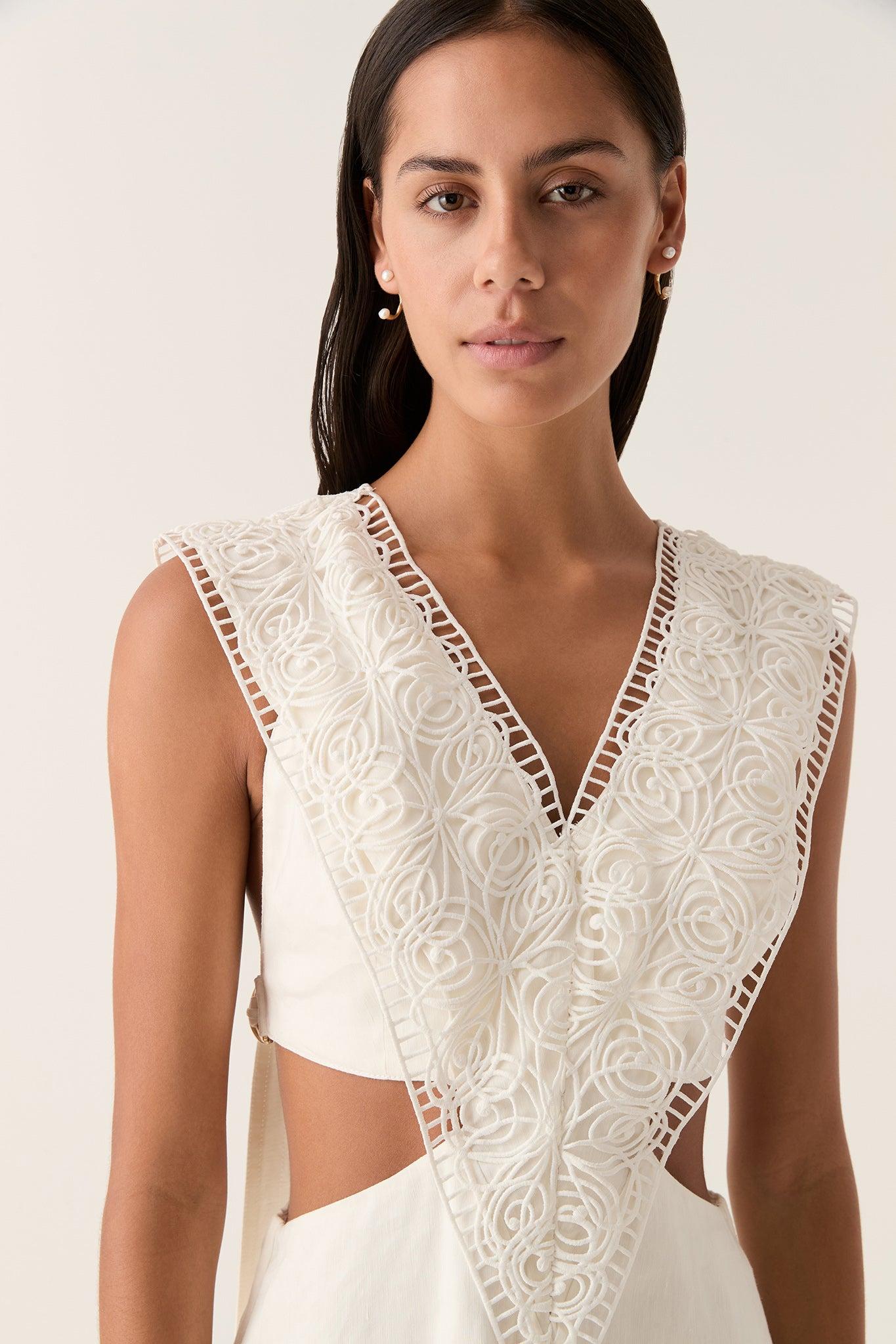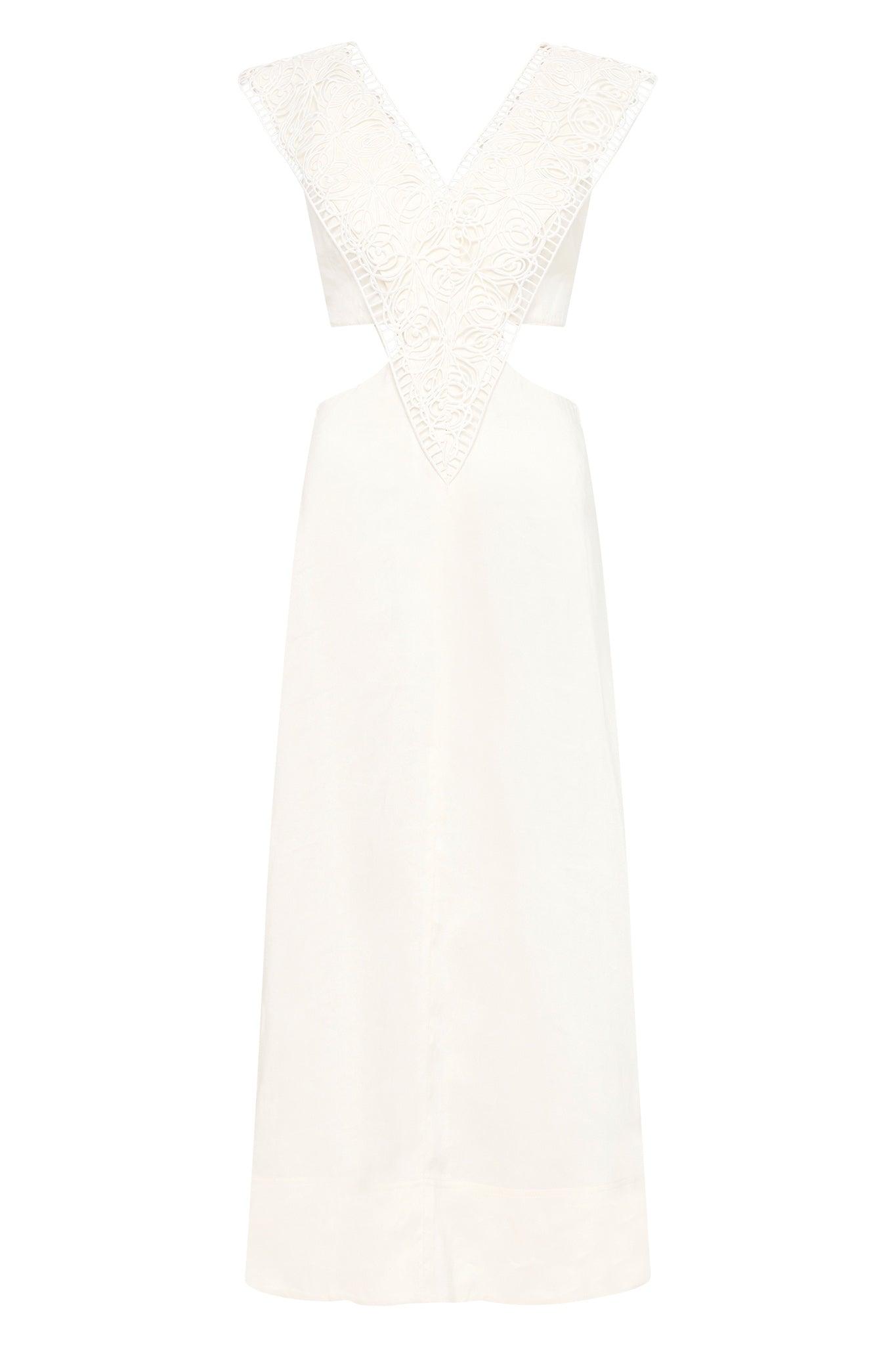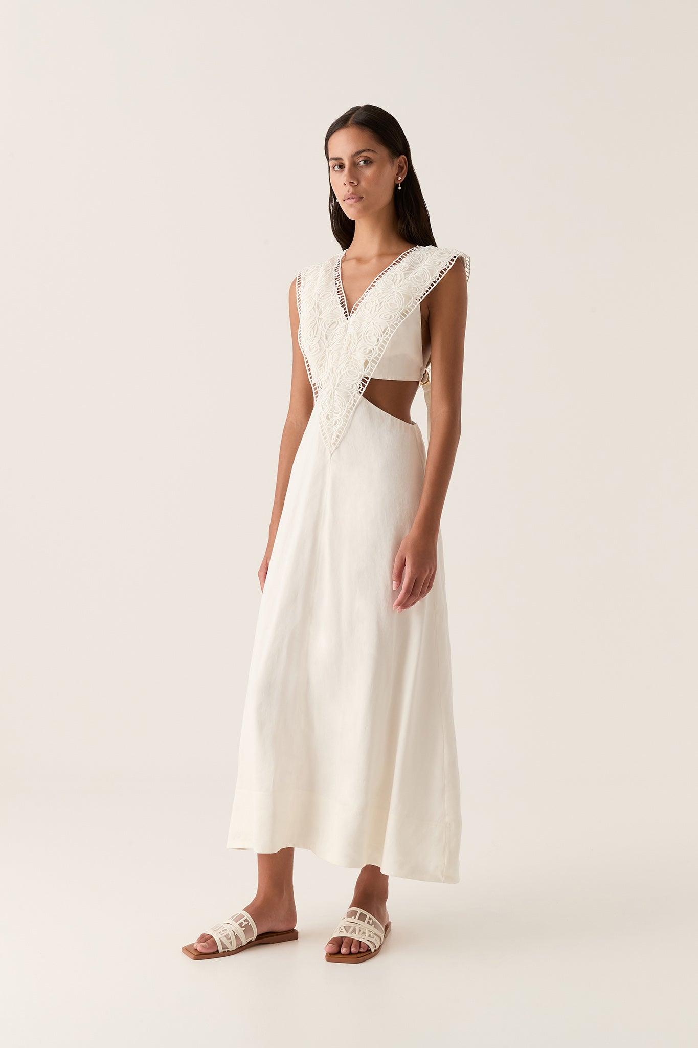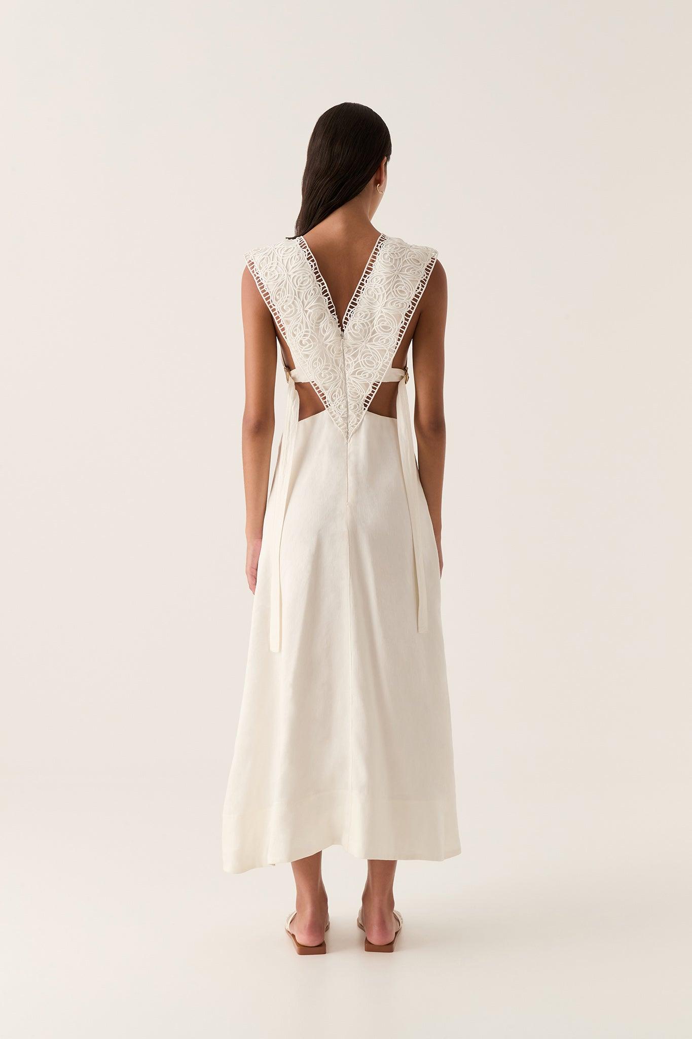 PRODUCT DETAILS Relaxed midi dress V-neckline with lace trim insert Waist ties with gold D-rings Voluminous A-line skirt Zip, hook and eye closure Lined style Shop All Dresses SIZE AND FIT Model wears a size 8/S Model: 178cm/ 5’10 Bust: 78cm Waist: 63cm Hips: 92cm FABRICATION 69% Linen 31% Viscose