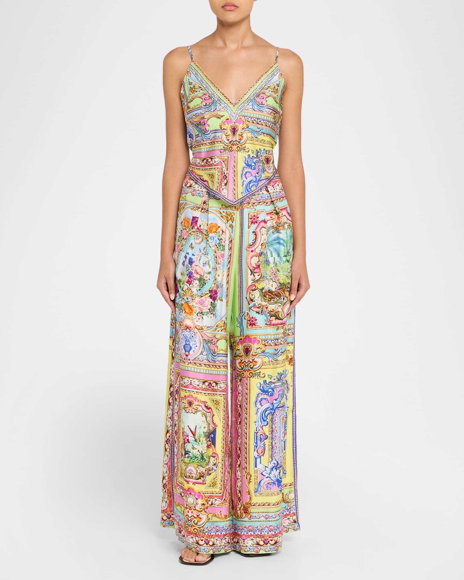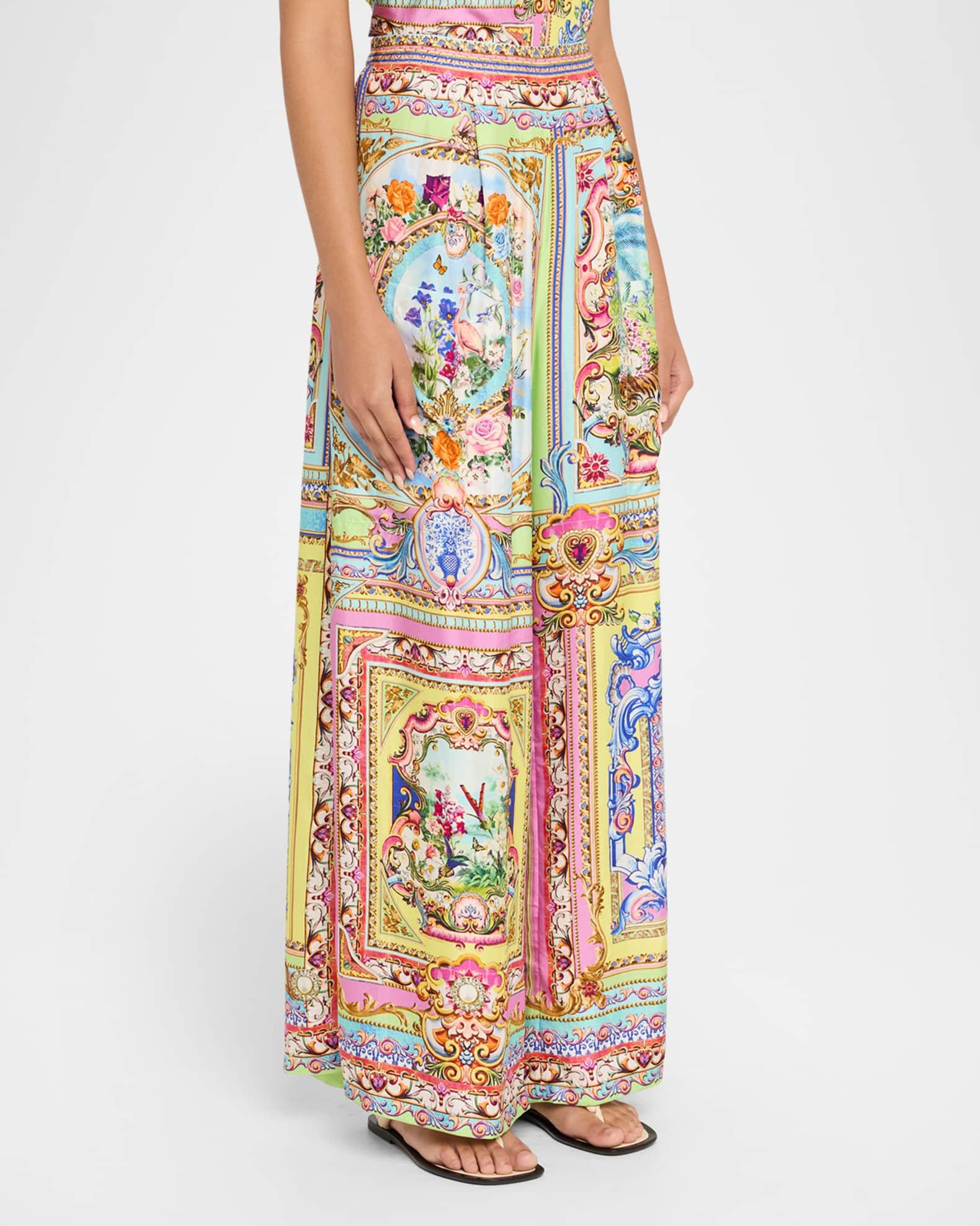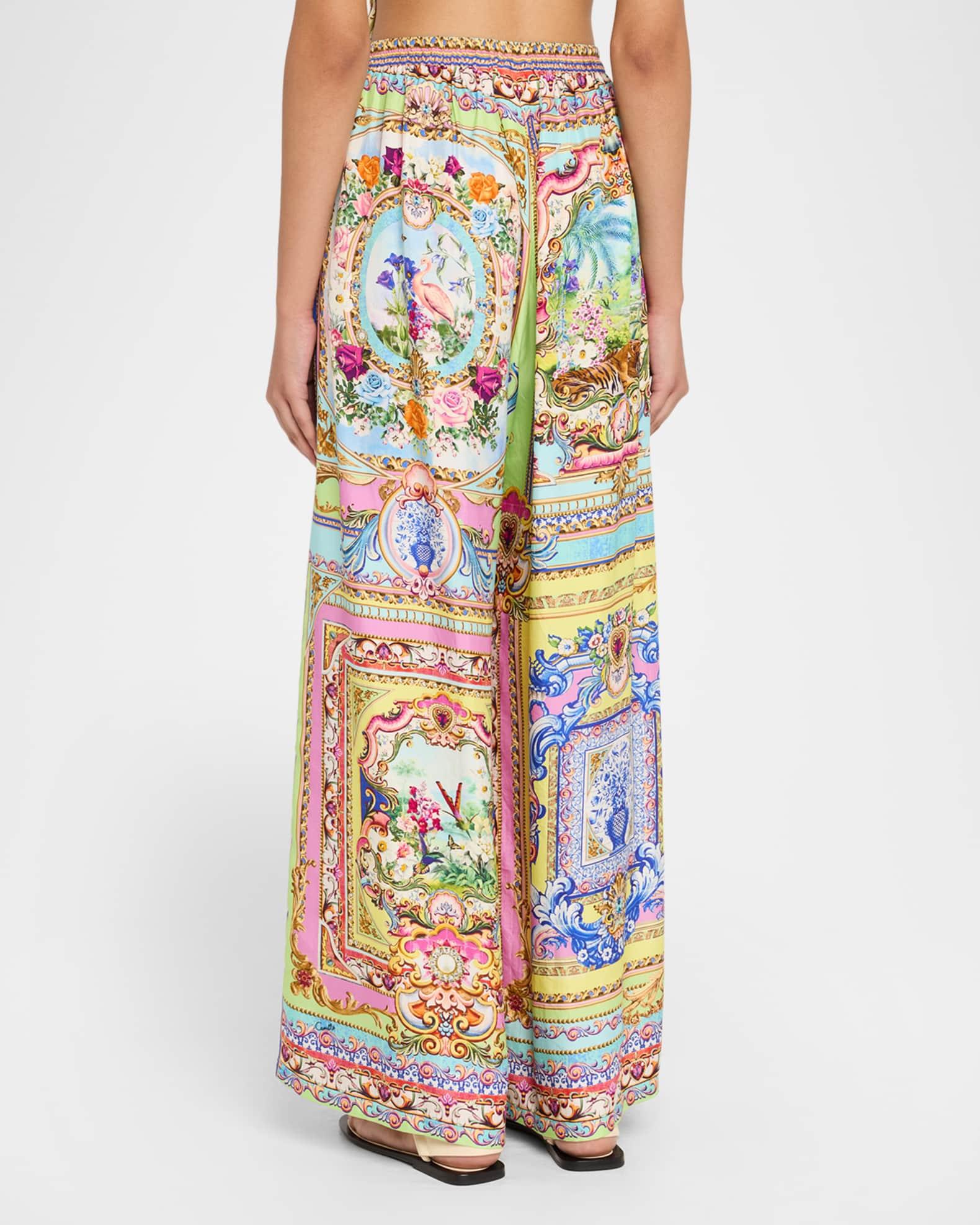 Illustrated with dynamic painterly prints, these trousers by Camilla are finished with crystal embellishments Mid-rise waistband Front patch pockets Wide legs Full length Pull-on style Silk Imported