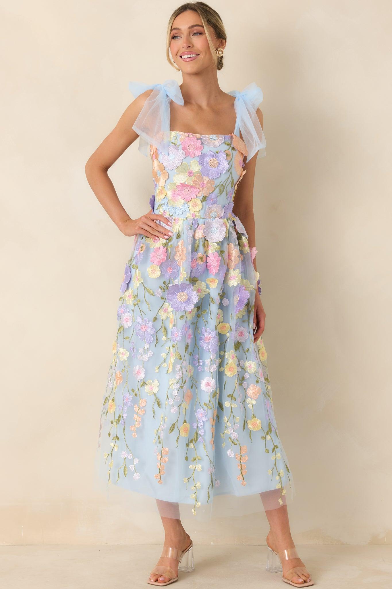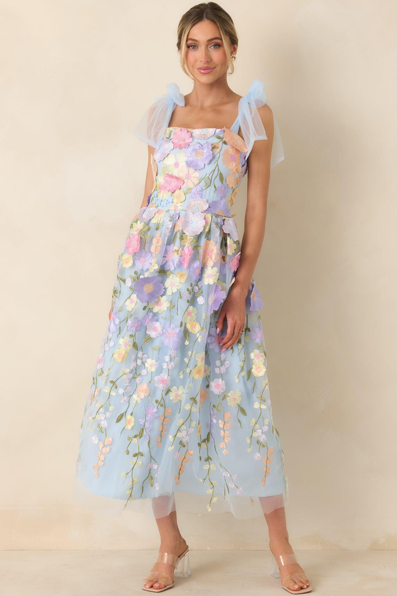 Introducing the Spirit of Spring Light Blue Floral Embroidered Maxi Dress! With delicate floral embroidery and a light blue hue, this dress is perfect for any spring occasion. Embrace the warm weather and show off your playful side with this quirky and stylish dress. This dress features a square neckline, tulle ribbon self-tie straps, a hidden zipper at the back, and an embroidered floral design throughout the dress. 100% PolyesterHand Wash ColdLined, 95% Polyester, 5% SpandexImportedModel is 5'8" and wearing a size small.