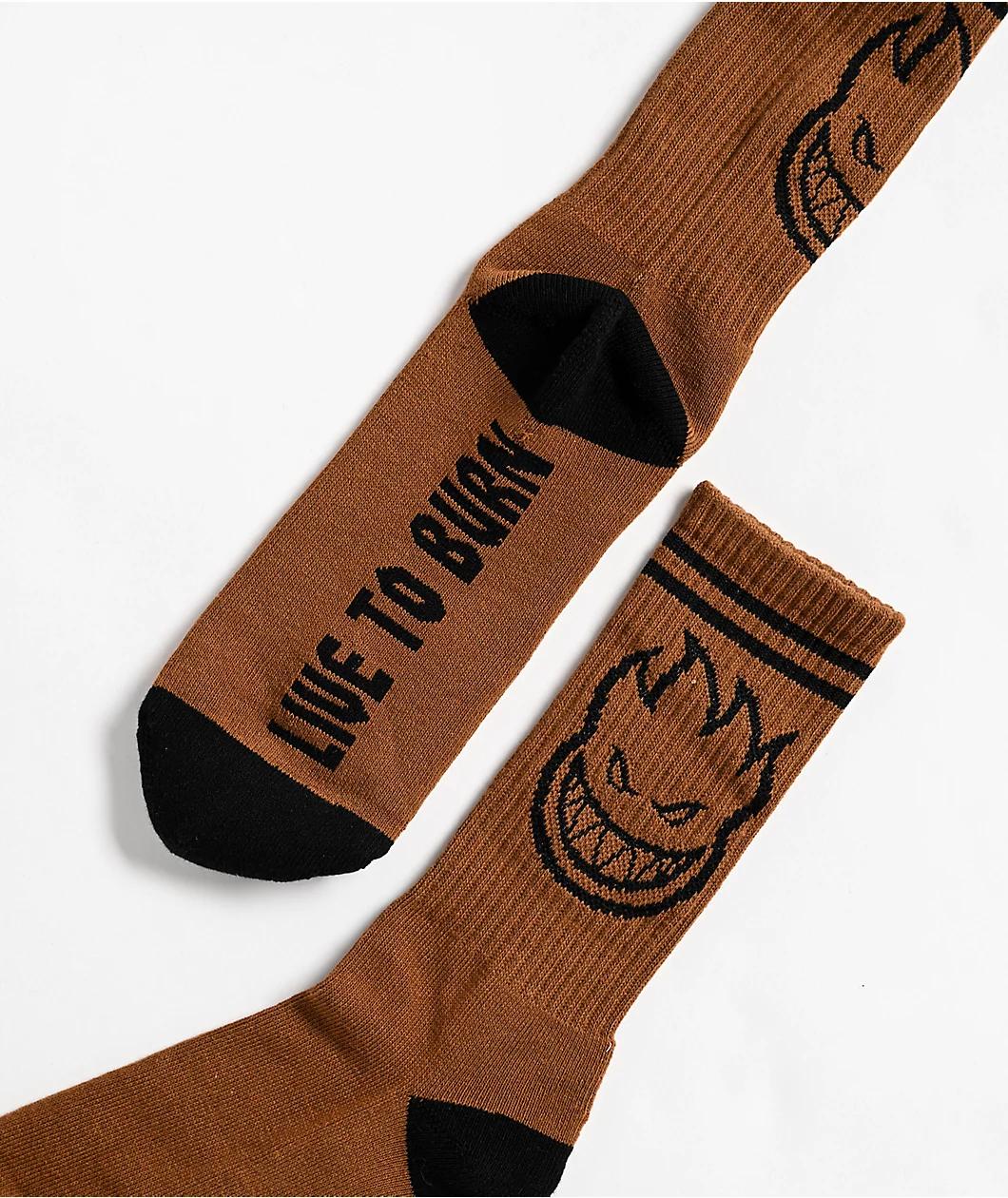 The minds at Spitfire welcome the Bighead socks in a tan and black colorway, showcasing a jacquard-knit logo on the ribbed upper. Made with a cozy cotton blend fabric, these crew-length socks have "Live to burn" on the padded footbeds while solid bla