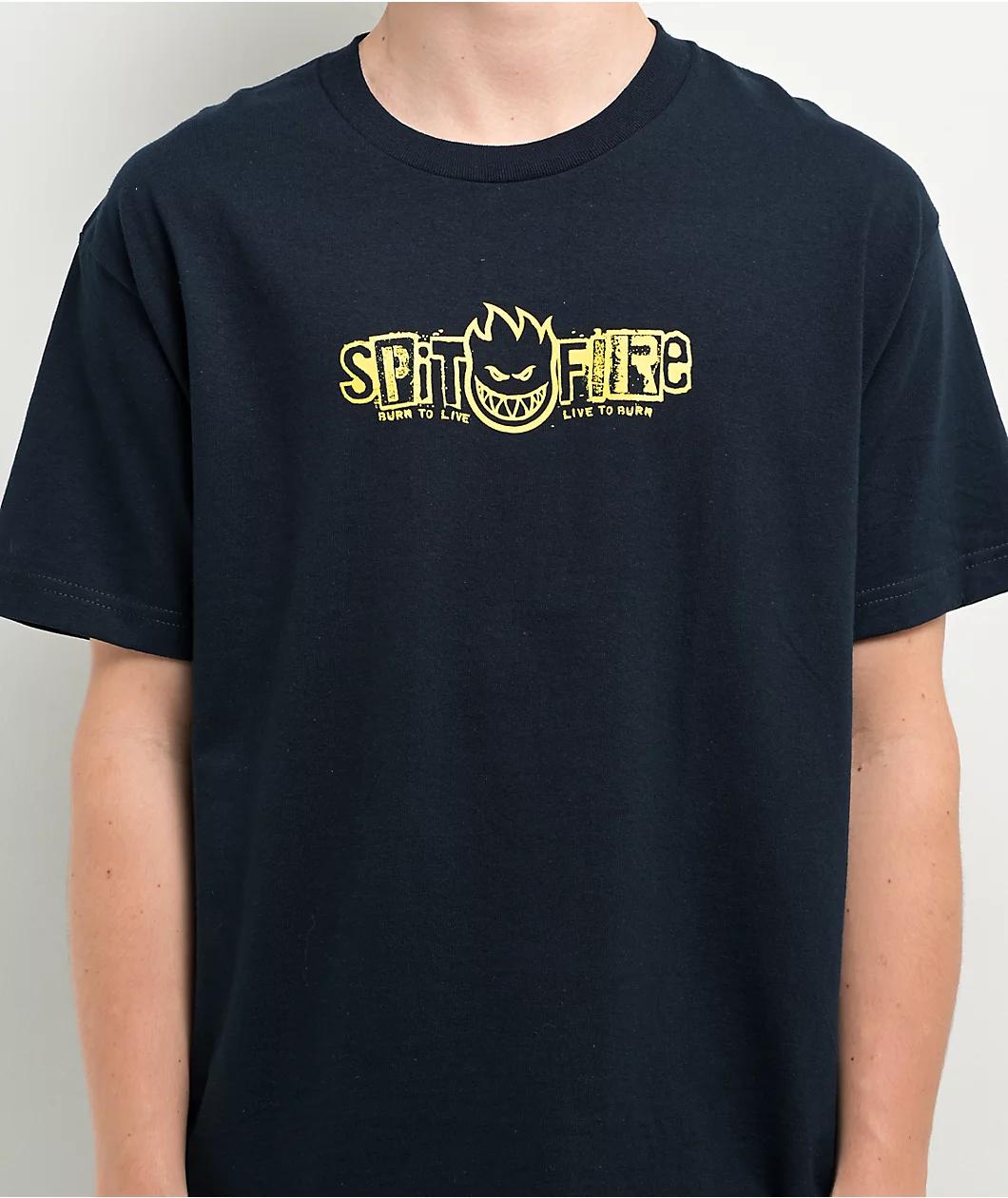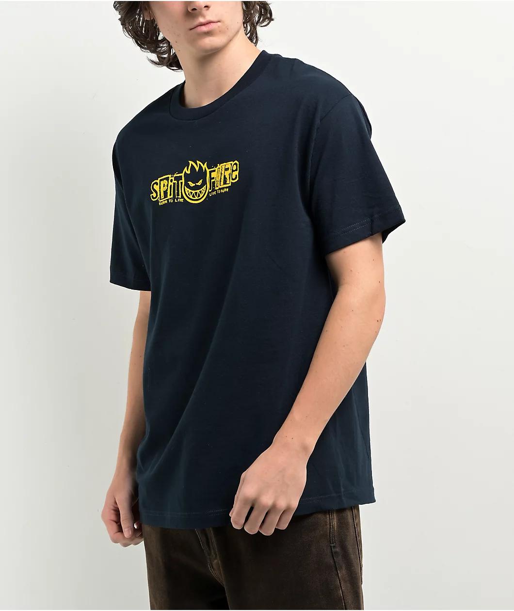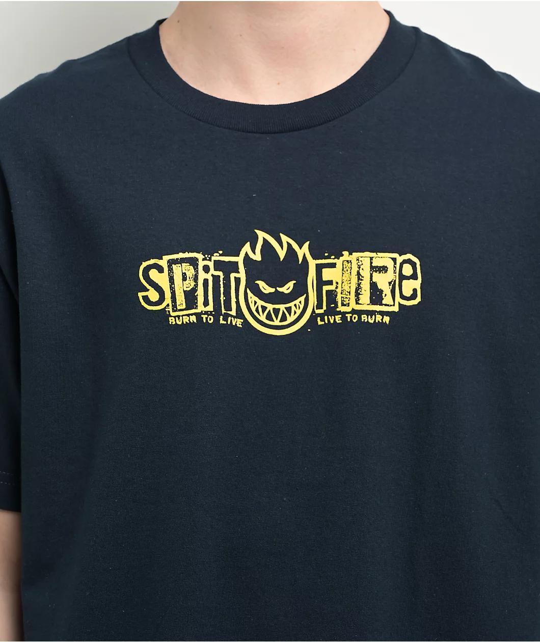 Represent skate brand Spitfire with the Ransom Bighead t-shirt, landing in a Navy blue colorway. Yellow screen-printed graphics on the chest feature a Bighead logo amongst branding script in a magazine cut-and-paste font for a Ransom letter look. Add